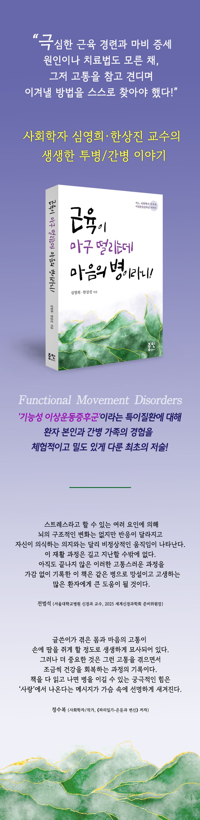 이 책은 ‘기능성 이상운동증후군’이라는 질환에 대해 환자와 간병 가족의 입장에서 체험적이고 밀도 있게 다룬 최초의 저술이다. 저자들은 자신의 경험을 나눔으로, 이 병을 포함한 희귀질환으로 고통받는 환자와 가족에게 조금이나마 도움이 되기를 바라며 회복의 희망을 함께 공유하고자 했다.