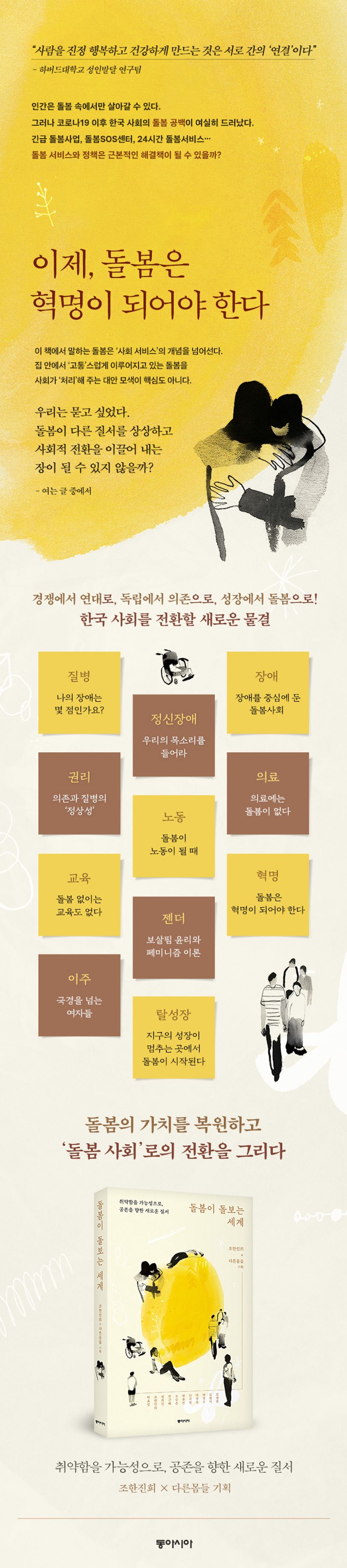 『돌봄이 돌보는 세계』에는 이렇듯 한 사회를 넘어 전 세계에 돌봄의 가치를 회복하고, 인종과 계급, 젠더를 초월해 모든 시민에게 돌봄의 권리를 분배하기 위한 구체적인 방안과 상상력이 담겨 있다. 기후위기와 체제 전환이라는 숙제 앞에 놓인 한국 사회가 찾을 수 있는 최선의 대안, 모든 시민을 행복하게 만들 유일한 희망이 ‘돌봄이 돌보는 세계’에 있다.