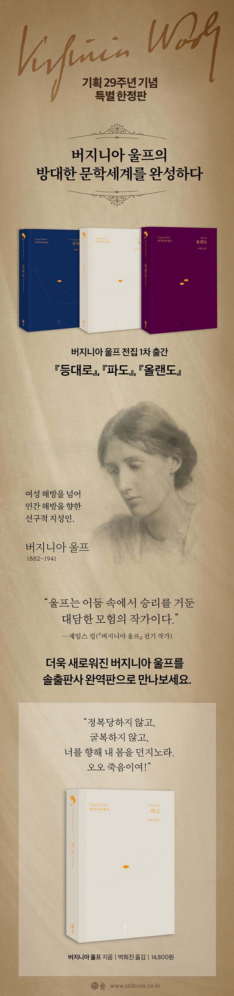 20세기 영국 문학의 대표적인 모더니스트이자 선구적 페미니스트인 버지니아 울프. 솔출판사에서 1990년 초반 기획 후 출간되기 시작한 ‘버지니아 울프 전집’이 29년 만에 완간을 기념하여 특별한 디자인과 더욱 가벼워진 판형으로 독자들을 찾아간다. 조이스, 프루스트와 함께 ‘의식의 흐름’의 대가라 불리는 울프는 이 실험적인 기법을 통해 인간 심리의 가장 깊은 곳까지 파고든 작가이다. 이번 솔출판사 특별 한정판은 기존 판형의 번역을 보완하고 정정하여 더욱 완결되고 안정된 번역으로 선보인다. 울프의 대표작인 『등대로』, 『파도』, 『올랜도』를 1차 출간하는 것을 시작으로 울프의 유작을 2019년 하반기까지 완간할 예정이다.
