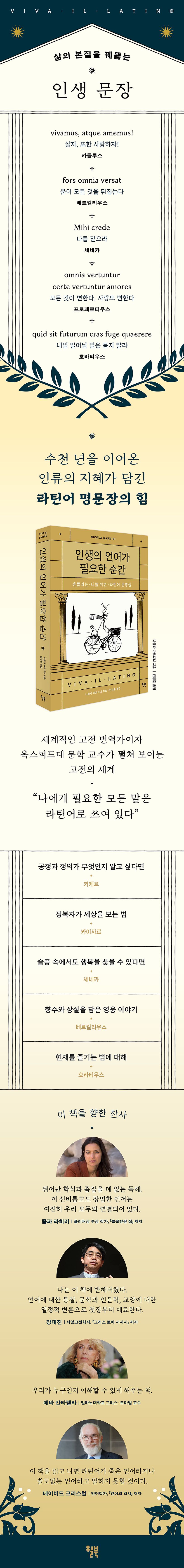 빠르게 올라가는 SNS 화면과 숏폼 영상 사이에서 무기력하게 시간을 보내다가 허망한 느낌을 받은 적이 있다면, 어느새 빈곤해진 어휘를 깨닫고 당황한 적이 있다면, 생각 없이 사람들에게 휩쓸리다가도 슬며시 경각심이 든다면, 지금이 바로 라틴어 문장을 만나야 할 순간이다.