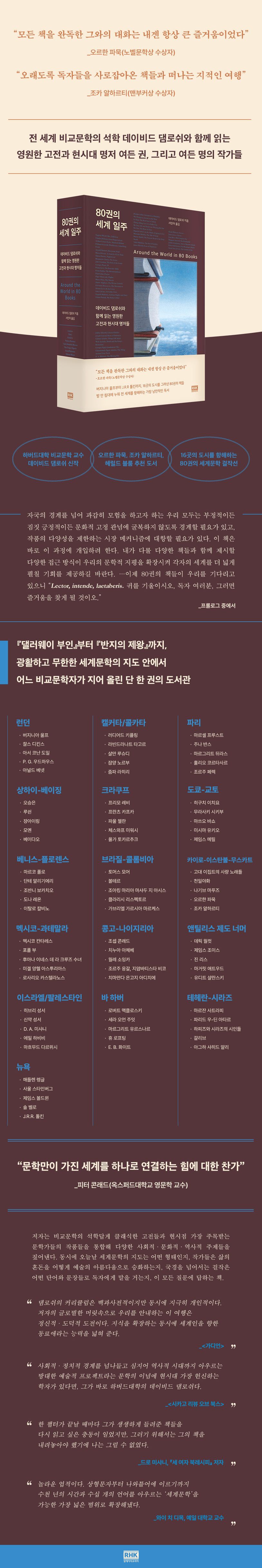 여든 권의 책과 여든 명의 작가들 외에도 세계문학사의 굵직한 이름들이 숱하게 언급되며, 지역별 역사와 사회상을 꼼꼼히 반영한 원고는 다소 낯선 만큼 읽는 이를 집중하게 만든다. 아직 국내에 번역조차 되지 않은 먼 나라의 생경한 이야기들도 각자만의 스토리텔링의 매력으로 기어이 독자를 책장 앞으로 다시 끌어다 앉힌다. 파편화된 현시대, 아무도 ‘왜’ 세계문학을 읽어야 하느냐는 원론적인 질문을 던지지 않지만, 그에 대해 저자가 평생에 걸쳐 파헤친 답변들을 들려준다. 동시에 오늘날 세계문학의 지도는 어떤 형태인지, 작가들은 삶의 혼돈을 어떻게 예술의 아름다움으로 승화하는지, 국경을 넘어서는 걸작은 어떤 단어와 문장들로 독자에게 말을 거는지, 이 모든 질문에 답하는 책이다.