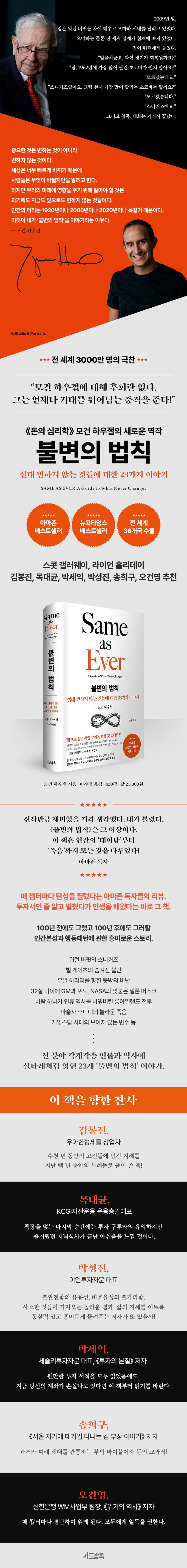 세계적인 베스트셀러 《돈의 심리학》의 저자 모건 하우절이 3년 만에 세상에 내놓은 신작.‘절대 변하지 않는 것들에 대한 23가지 이야기’를 전한다. 출간하자마자 아마존과 뉴욕타임스 베스트셀러 자리에 오르며 아마존 독자들과 오피니언 리더들의 극찬을 받았다.
