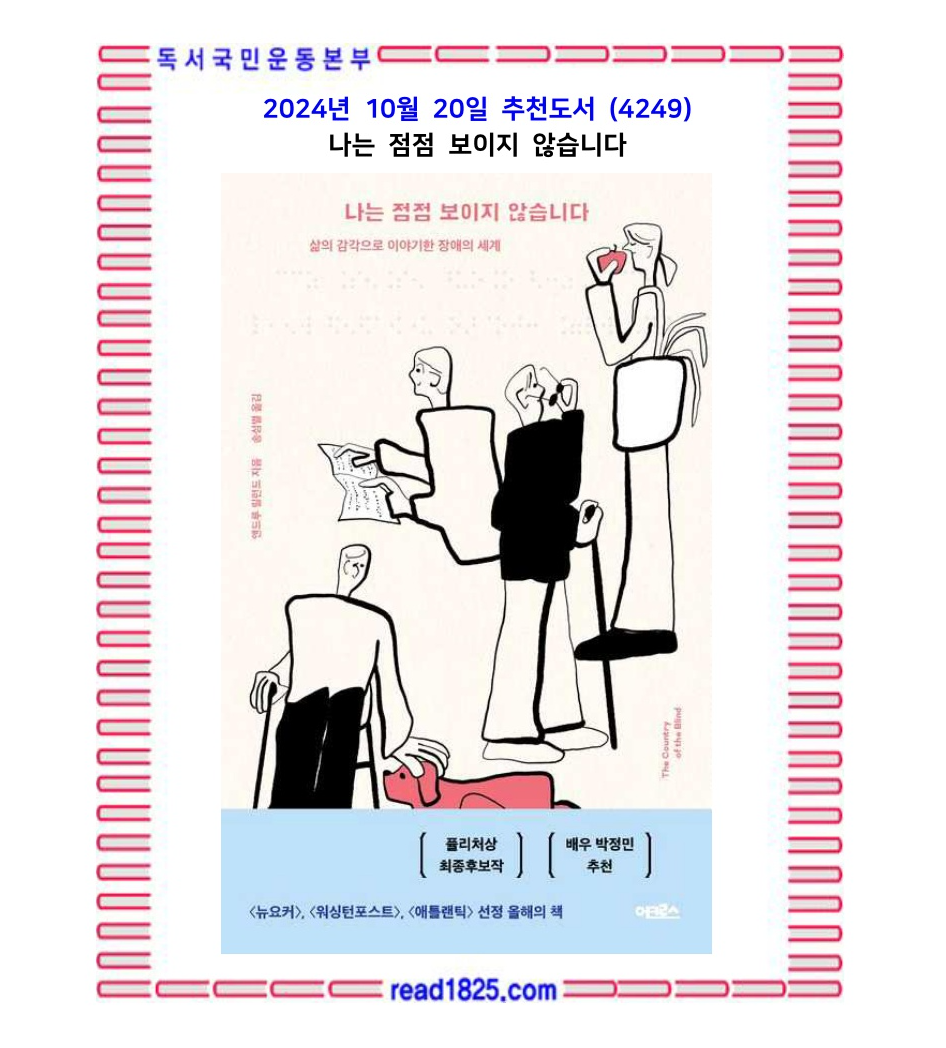 시각장애인을 위한 영화 화면해설 상영회, 배리어프리 영화에 대한 내레이션 재능기부, 시각장애인 오디오북 제작사업의 낭독 봉사자 참여 등 다양한 활동을 펼쳐왔던 배우 박정민이 추천사를 작성하여 시각장애에 대한 이해를 넓혀줄 책의 내용을 소개하기도 했다. 박정민은 시각장애인인 아버지에 대해 언급하며 가족으로서, 공동체의 일원으로서 우리가 해야 할 일이 있음을 이야기한다.