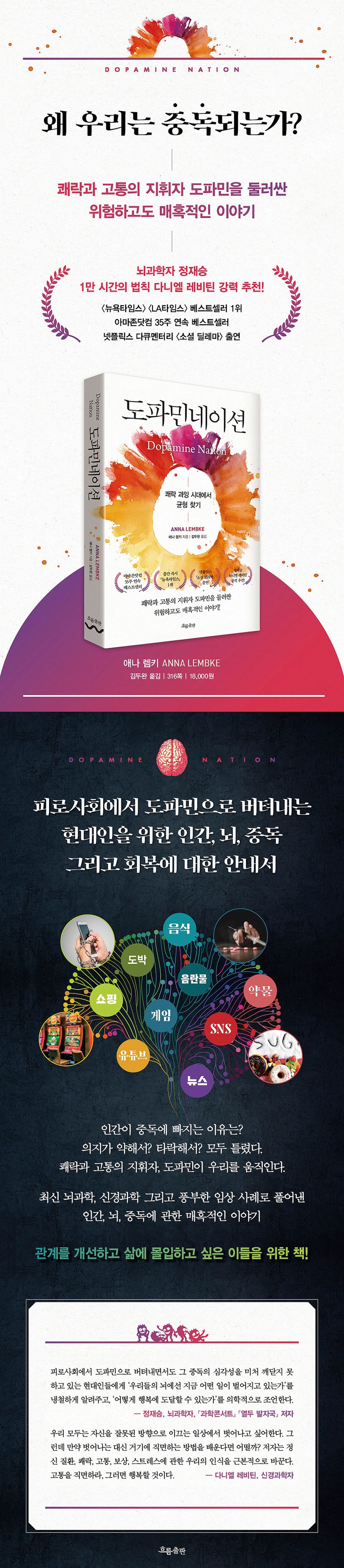 그런데 2021년 미국에서 출간돼 지금까지 뜨거운 논쟁을 일으키고 있는 『도파민네이션』은 인간이 중독에 빠지는 이유를 의지, 도덕성의 결핍이 아니라 쾌락과 고통을 지휘하는 신경물질, 도파민에서 찾고 있다. 또한 중독성 물질, 자본주의, 디지털이 결합된 현실 때문에 중독은 더 이상 개인의 문제가 아닌 모두의 문제, 사회 전체의 관점에서 바라봐야 한다고 주장한다.