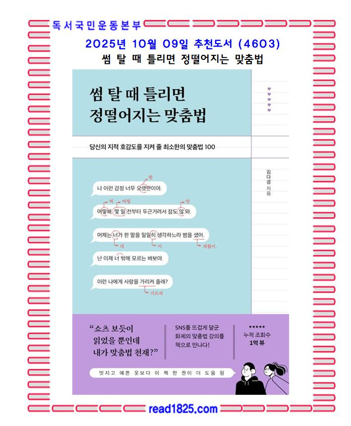 썸 탈 때 톡 하면서, 소개팅 전에 카페에서 기다리면서, 혹은 퇴근길 지하철 안에서 가볍게 펼쳐보자. 쇼츠를 보듯 책장을 넘기다 보면 자연스럽게 올바른 맞춤법이 머릿속에 저장될 것이다.