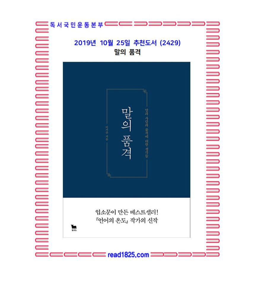 이 책은《언어의 온도》로 많은 독자의 사랑을 받고 있는 이기주 작가의 신작 에세이집이다. 경청, 공감, 반응, 뒷말, 인향, 소음 등 24개의 키워드를 통해 말과 사람과 품격에 대한 생각들을 풀어낸다. 고전과 현대를 오가는 인문학적 소양을 바탕으로 이기주 작가 특유의 감성이 더해 볼거리와 생각할 거리를 동시에 전한다. 말을 소재로 삼은 까닭에 남녀노소 구분 없이 읽을 수 있는 교양서이자 필독서이기도 하다.