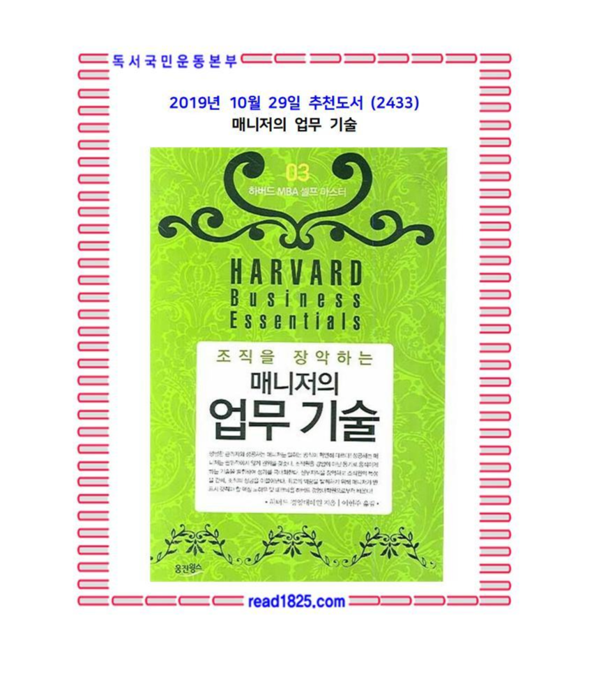 「하버드 MBA 셀프 마스터 시리즈」제3편『조직을 장악하는 매니저의 업무 기술』. 이 책은 자신의 역량을 모두 발휘하기 위해 관리자(매니저, 리더)가 반드시 갖춰야 할 핵심 노하우 및 테크닉을 소개한다.