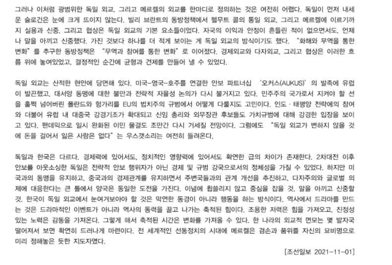 메르켈은 정치는 이렇게 작동해야 한다는 전형을 보여준 정치인이다. (…) 메르켈은 재임 16년간 단 한 건의 스캔들에도 연루되지 않았다. (…) 메르켈이 추구한 합의의 정치는 이러한 도덕성을 바탕으로 한 자신감에서 나왔다.