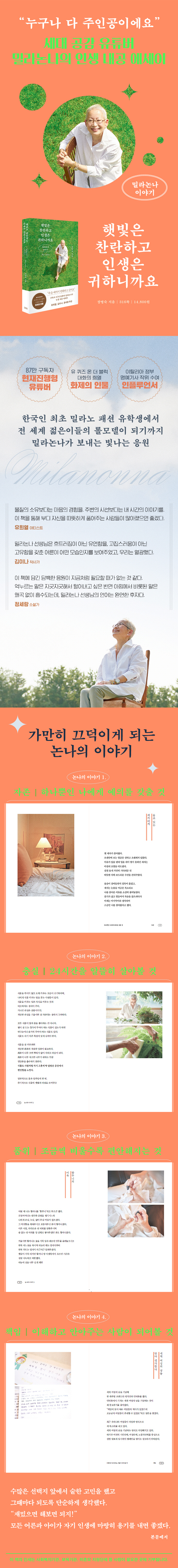 《햇빛은 찬란하고 인생은 귀하니까요》는 완고한 고집보다 유연한 소신을 가진 밀라논나의 인생 내공을 담은 에세이다. “하나뿐인 나에게 예의를 갖”추면서 “이해하고 안아주는 사람이” 되기까지의 과정이 고스란히 담겨 있고, 평생 쌓인 경험과 지혜가 오롯이 스며 있다. 세월의 흐름에 따라 자연스레 습득한 봉사와 검약의 생활 철학과 지속가능한 삶을 위한 조언을 전하고, 유튜브에서 못다 한 속 깊은 이야기도 풀어놓아 진짜 멋이 무엇인지 생각하게 한다.