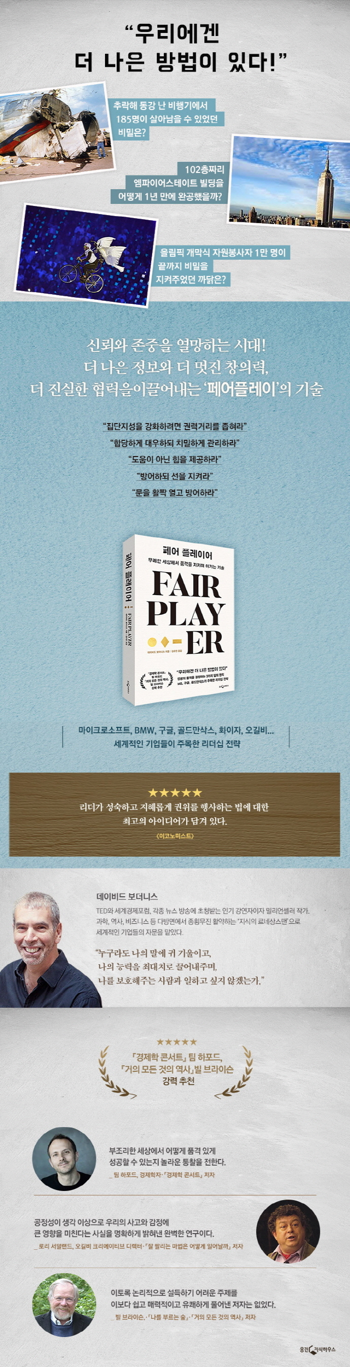 세계적인 밀리언셀러 저자이자 스토리텔링의 귀재 데이비드 보더니스가 제시하는 새로운 시대의 성공 전략. 추락하는 비행기에서 끝까지 사투를 벌인 기장은 기체가 네 동강 났음에도 불구하고 185명의 목숨을 살릴 수 있었다.장비 하나 없는 지방 출신 건설업자는 102층짜리 엠파이어스테이트 빌딩을 불과 약 1년 만에 완공해냈다.최고의 올림픽 개막식으로 손꼽히는 런던 올림픽은 깜짝쇼를 성공적으로 연출해냈고,자원봉사자 1만 명 중 누구도 끝까지 비밀을 발설하지 않았다.그리고 이 모든 성공 스토리에는 단 하나의 심플한 가치가 자리하고 있었다.바로 ‘공정성’이다.