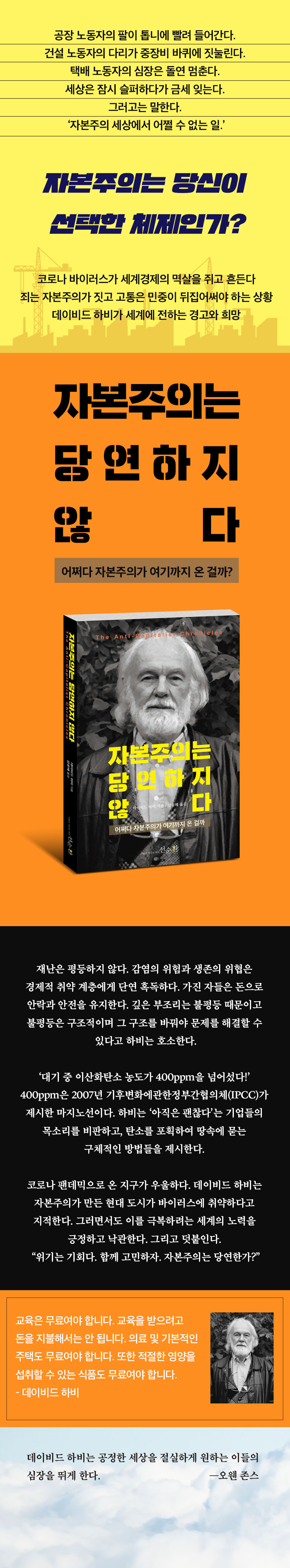 코로나 바이러스의 창궐로 세계 경제가 흔들린다. 세계화가 전염병의 원인이며 그로 인한 고통은 무자비한 자연 파괴를 일삼아 온 신자유주의에 대한 자연의 보복이라고 하비는 경고한다. 하지만 재난은 평등하지 않다. 감염의 위험과 생존의 위협은 경제적 취약 계층에게 단연 혹독하다. 가진 자들은 돈으로 안락과 안전을 유지한다. 깊은 부조리는 불평등 때문이고 불평등은 구조적이며 그 구조를 바꿔야 문제를 해결할 수 있다고 하비는 호소한다. 자본주의는 당연하지 않다.