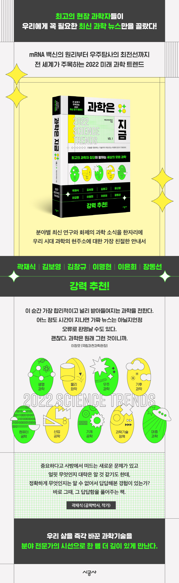 각종 코로나19 백신의 원리, 패권 국가들의 이해관계가 집약된 반도체 전쟁, 일론 머스크의 생각 읽는 칩, 번식이 불가능한 유전자변형 모기 살포, 현존 최강 인공지능과의 인터뷰, 우주탐사의 최전선, 기후 위기 등 궁금증을 불러일으키는 주제가 가득하다. 논란의 한가운데 있는 첨예한 과학적 대립을 해설하고 예측 불허의 신기술, 우리나라의 과학기술정책에서 SF로 살펴보는 과학문화까지 풍성하게 더해진다. 흥미 위주로 자극적인 정보를 던지는 수준을 넘어 각각의 바탕이 되는 원리를 착실히 설명하기에 누구나 쉽게 읽을 수 있다.