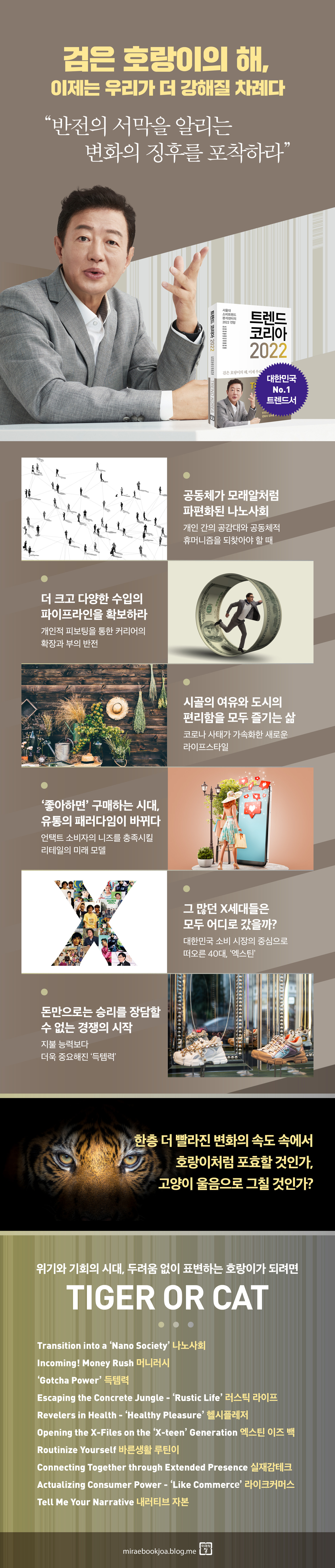 니체의 말이다. 거의 2년이 넘는 팬데믹 속에서도 우리는 삶을 이어왔고 고통과 절망 속에서도 미래에 대한 희망의 끈을 놓지 않았다. 획기적이고 거침없는 기술의 발전은 오히려 우리가 꿈꾸던 세상을 더욱 앞당기고 있다. 미증유의 전염병과 현명하게 공생하는 ‘위드 코로나’를 준비하면서 이제 우리는 더 강해지고 있다. 검은 호랑이의 해를 맞아, 서울대 소비트렌드분석센터는 10개의 키워드 두운을 “TIGER OR CAT”으로 잡았다. 팬데믹 위기 상황에 얼마나 잘 대처하느냐, 기업보다 진화의 속도가 더 빠른 소비자들의 니즈를 어떻게 맞출 것인가, 더 나아가 유권자들의 마음을 어떻게 얻을 것인가? 거침없이 포효하는 호랑이가 될 것인가, 고양이가 될 것인가?