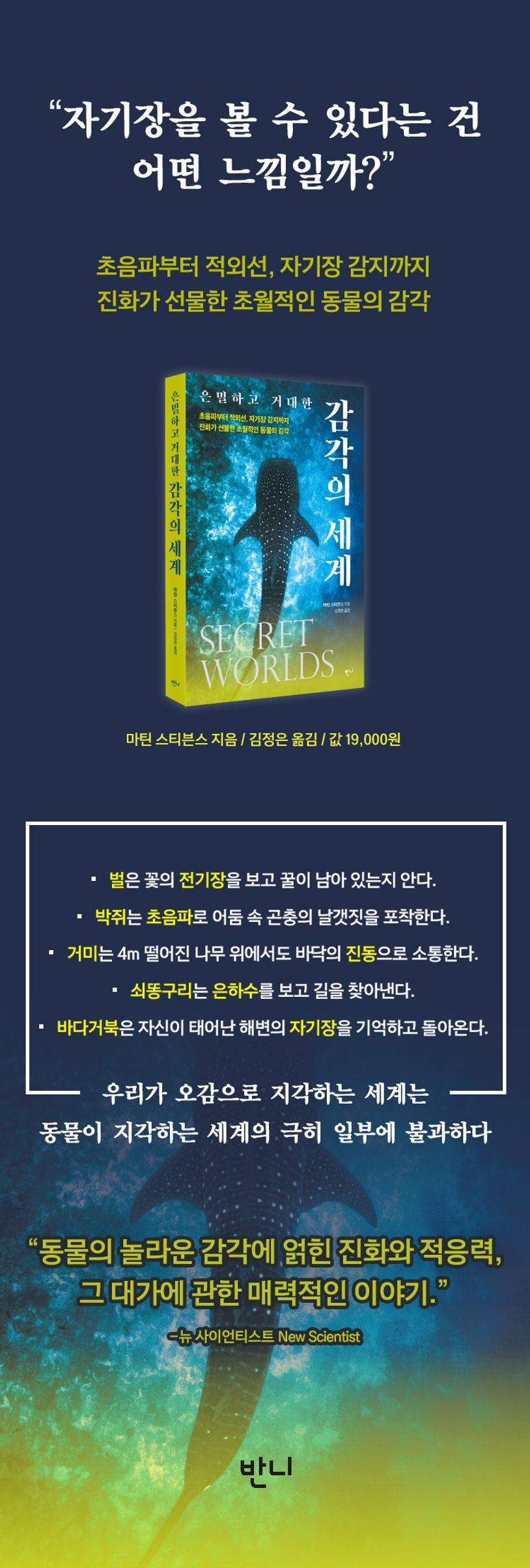 인간은 스스로를 지구상 최고의 생명체라 여기지만, 사실 인간이 지닌 감각은 동물의 감각에 비하면 초라한 수준이다. 과학기술이 발달하면서 인간보다 훨씬 뛰어난 감각이 지닌 동물들이 우리가 경험하지 못하는 세계를 지각하고 있다는 사실이 점차 밝혀지고 있다. 감각 및 진화생태학 교수인 마틴 스티븐스는 조금씩 그 모습을 드러내는 동물의 감각 세계를 대중에게 친절하게 들려주는 이야기꾼이다. 그는 이 책 《은밀하고 거대한 감각의 세계》에서 동물들이 지닌 놀라운 감각과 그 역할, 작동방식을 생생하게 보여준다.