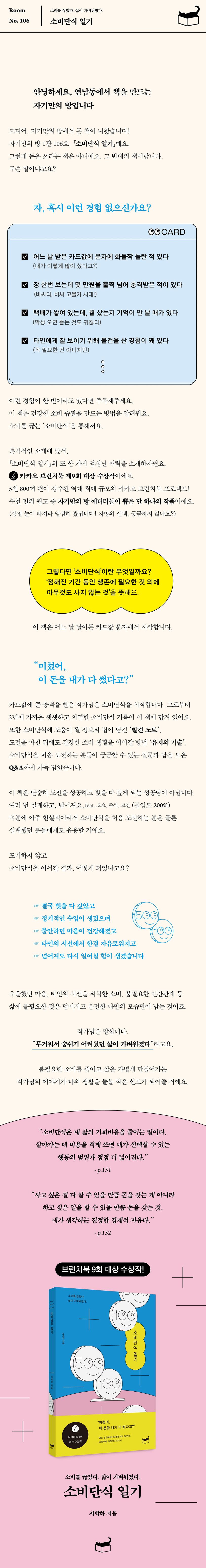 어느 날 내가 어디에 썼는지 기억도 안 나는 카드값을 받아든다면? 그런데 그것이 전부 내가 쓴 것이 맞다면? 온갖 재테크 방법을 시도해봤지만, 번번이 실패했던 작가는 카드명세서를 받아들고는 충격을 받아 생존을 위해 필요한 것 외에는 아무것도 사지 않는 ‘소비단식’에 뛰어듭니다. 그 2년간의 치열한 기록을 책으로 묶었습니다. 5천 800여 편, 역대 최대 규모의 응모작이 접수된 브런치북 출판 브로젝트의 대상 수상작입니다. 수천 편의 원고 중 자기만의 방 에디터들이 뽑은 단 하나의 작품이에요. 치솟는 물가, 경제 불황이 이어지는 고물가 시대에 소비를 끊고 자신의 삶을 가볍게 만들어가는 생생한 이야기가 나의 생활을 돌볼 새로운 작은 돌파구이자 힌트가 되어줄 거예요.