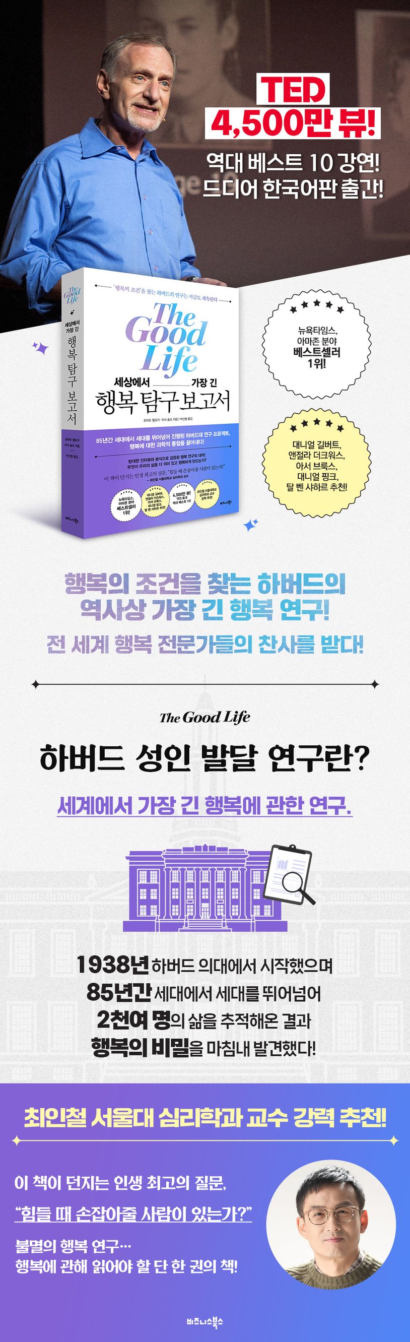 하버드 성인 발달 연구팀이 85년간 행복에 대해 연구한 성과를 담은 책이 마침내 출간되었다. 《세상에서 가장 긴 행복 탐구 보고서》는 행복 연구의 대작으로 평가받으며 출간되자마자 뉴욕타임스, 아마존 분야 베스트셀러 1위에 올랐다. 또한 무엇이 우리의 삶을 더 의미 있고 행복하게 만드는지에 대해 연구 중인 전 세계의 학자들은 이 책에 무한한 경의를 표했다.