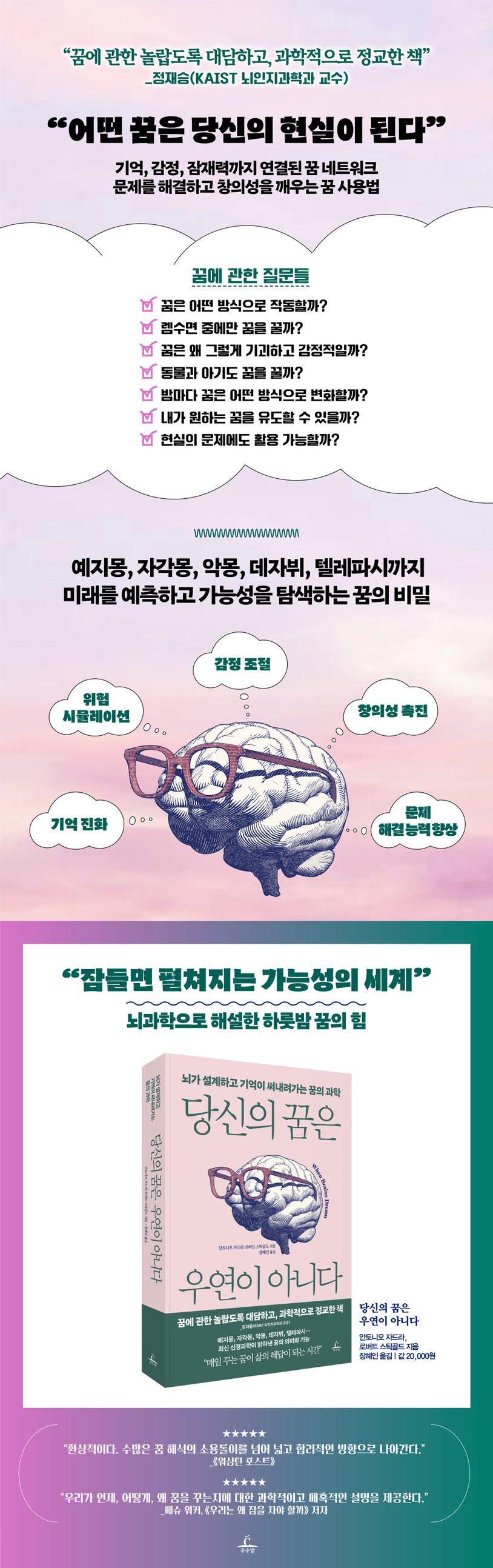 소설 《구운몽》, 영화 〈인셉션〉, 살바도르 달리의 그림의 공통점은 무엇일까? 바로 ‘꿈’이다. 꿈은 누구나 잠들면 마주할 수 있지만, 꿈꾼 사람만이 경험할 수 있는 개인적 영역이다. 또 현실처럼 생생하지만 깨어나고서야 꿈이라는 것을 알게 된다. 이 묘하고 신비로운 세계는 인류의 역사와 함께 탐구되어왔고, 수많은 예술·문학작품의 소재가 되기도 했다. 명확히 정의하기 어려운 탓에 꿈은 긴 시간 비과학적인 현상으로 여겨졌으며 주로 정신분석학적으로 논의되었다. 하지만 알고 보면 꿈은 과학적이다. 현실에서 일어나는 사건을 다루고 인지적 토대에 바탕을 둔다.