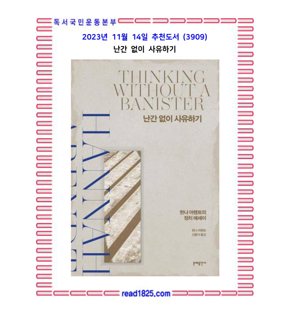 이 책의 제목인 ‘난간 없이 사유하기’는 아렌트의 정치 사유를 표현하는 대표적인 말이다. ‘난간’은 우리가 사유하고 판단할 때 기대는 전통적인 개념으로, 난간을 붙들지 않고 사유한다는 것은 우리의 정신을 지배하는 모든 것에서 벗어나 자유롭게, 완전히 새롭게, 기준도 틀도 없이 사유한다는 의미라고 볼 수 있다. 난간이 없다는 것은 자유로우나 위험하며, 언제 끝모르는 바닥으로 곤두박질칠지 모른다는 두려움과 부담을 안고 계단을 올라야 한다. 하지만 사유란 그런 것이다. 위험하지만 용기 있게 나아가는 것, 어디에도 의존하지 않고 치열하게 사유한 끝에야 세상과 인간, 자유와 삶, 정치가 무엇인지 가닥을 잡을 수 있고 그 속에서 인간다운 삶과 정치를 이야기할 수 있다. 아렌트의 에세이에는 고전 철학부터 중세 철학, 근대의 지형을 바꾼 혁명들, 양차 세계대전 등 철학, 역사, 정치사가 망라되어 있다. 아렌트는 그 내용을 하나하나 짚으면서도 전통적인 기준과 틀의 한계를 벗어나 새로운 시각으로 현상과 사건의 의미를 좇는다. 대답하는 자가 아닌 질문하는 자로서 끊임없이 질문을 던지면서 진정한 난간 없는 사유를 보여준다.