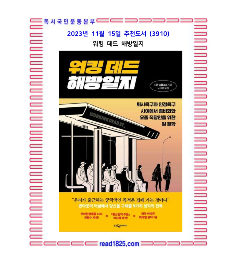 일은 중요하다. 그런데 일이 너무나 중요한 나머지, 때로는 나 자신보다 더 중요하게 느껴질 때조차 있다. 일이 자신의 일부가 아니라 일이야말로 곧 자기 자신이라고 생각하는 독자라면 『워킹 데드 해방일지』에 빠져들지 않을 도리가 없을 것이다. 일은 일이고 나는 나고 여가는 여가라고 말하면서도 삶의 희노애락 많은 부분이 일과 관련되어 있음을 알았을 때 번아웃을 경험한 나로서는, 이 책이 들려주는 이 시대의 ‘일중심주의’라는 화두가 나의 것이라고 느꼈다. 또한 나의 친구들의 것이라고도. 신 대신 일에 의지하는 시대를 살아가는 모두에게 권한다.
