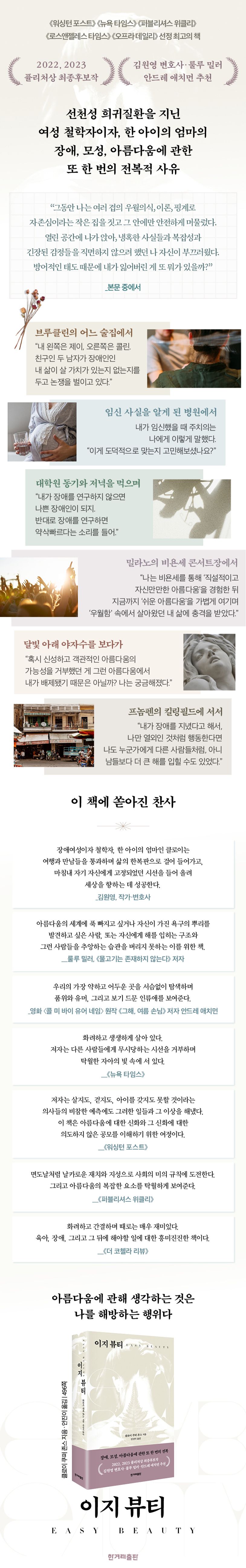 《이지 뷰티》가 장애·소수자 문제를 다룬 여타의 책과 다른 점은 자기 존재에 확신을 가지고 세상에 문제제기하며 적극적으로 저항하는 데 머물지 않는다는 점이다. 장애를 지니고 태어났던 그에게 ‘천골’이 누락된 자신의 몸은 처음부터 ‘불완전한 몸’은 아니었다. 하지만 세상 사람들에게 끊임없이 부정당하고 상처받으며 자신이 ‘장애인’임을 깨닫자 클로이는 본능적으로 이를 외면한다. 그러면서 자신에게 ‘누락된’ 부분을 학문적·정서적인 내면의 아름다움을 추구하며 철학자의 말들 속에 숨어 지내는 방법으로 자신을 지키며 살아간다. 책에는 그런 자기방어적인 태도로 ‘구경꾼’처럼 관조하며 살아왔던 그의 삶의 과정이 담담히 그려져 있다. 그러나 어릴 적 자신을 거부했던 공간을 비롯해 여러 곳을 여행하는 동안 저자는 ‘장애’ ‘모성’ ‘아름다움’에 대한 자신만의 새로운 답을 찾아나간다. 여행지에서의 사유에 녹아 있는 아리스토텔레스, 플라톤, 아이리스 머독 등 철학자들의 말을 빌린 저자의 아름답고 은유적인 문장들을 마주하다 보면 깊은 문학적 정수를 맛볼 수 있다. 책의 추천사를 쓴 김원영 변호사가 “이 과정을 따라가는 일은 문학적 체험이면서 여행이었고, 매우 신체적이면서도 철학적인 경험이었다”고 말한 까닭이다.