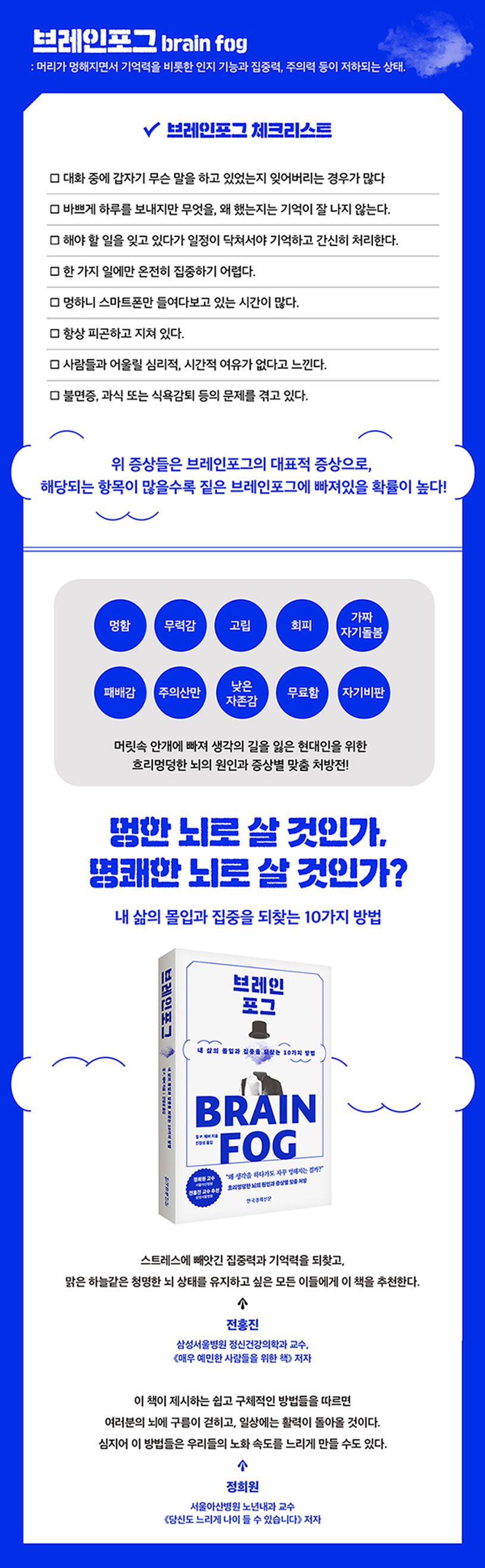저자는 브레인포그가 개인이 문제가 있어 겪는 것이 아니라, 누구나 살면서 경험할 수 있는 증상임을 강조하며, 실제 상담했던 내담자들의 사례와 그들이 브레인포그에서 빠져나오는 과정을 함께 담아냈다. 누구나 부러워하는 조건을 모두 갖췄지만 행복하지 않다고 느끼는 여자, 재택근무를 시작하며 급격하게 주의산만의 늪에 빠진 직장인, 화기애애한 분위기로 소개팅을 마쳤지만 자신감이 없던 남자 등. 우리가 흔히 겪는 공감 가는 일상의 문제들과 이 문제를 해결해 나아가는 과정을 통해 독자들은 브레인포그를 극복하는 방안을 자연스럽게 터득하게 될 것이다.