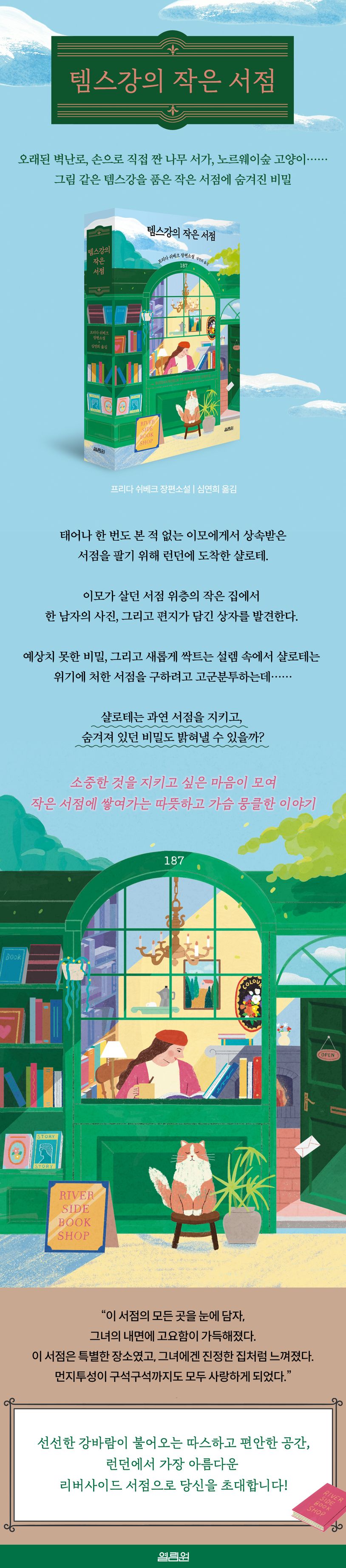 『템스강의 작은 서점』은 “독서 애호가들에게 더없이 완벽한 장소”인 리버사이드 서점을 배경으로, 책을 사랑하는 이들의 크고 작은 소란 속으로 독자들을 초대한다. 손으로 직접 짠 나무 서가, 대리석 선반이 달린 벽난로, 떡갈나무 계산대, 해리포터 계단 방을 본떠 만든 작은 공간까지. 과거로 시간 여행을 온 듯 착각하게 만드는 인테리어와 더불어 모든 고객에게 맞춤 책 추천이 가능한 직원들은 이 서점을 더욱 특별하게 만든다. 올가을, 책 읽고 싶은 마음을 훈훈하게 만족시켜줄 소설을 찾고 있는 독자라면, 시원한 강바람이 드는 런던의 작은 서점으로 당신을 안내하는 이 책을 펼쳐보기 바란다.