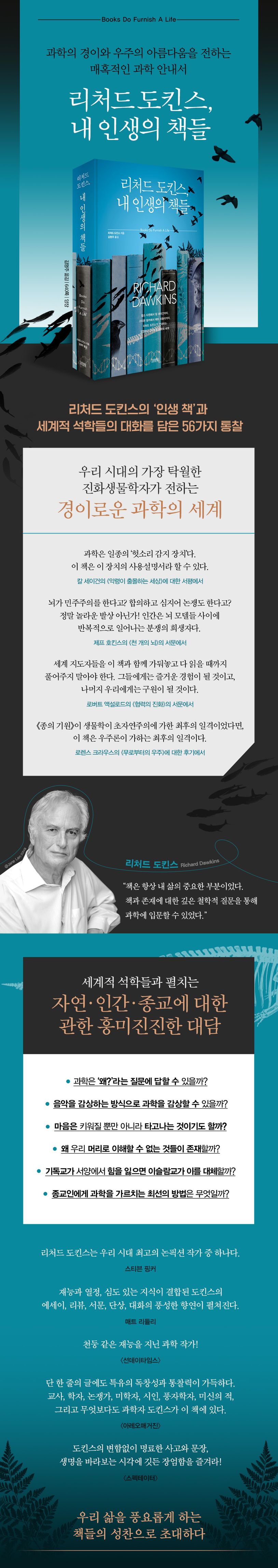 그렇다면 그는 어떤 책을 읽고 어떤 글을 썼을까? 우선 각 장의 서두는 닐 디그래스 타이슨, 스티븐 핑커, 로렌스 크라우스, 매트 리들리 등 세계적 석학들과의 대화로 시작된다. 자연에 대한 찬사, 인간에 대한 탐구, 신앙에 대한 질문 등 진화론ㆍ자연선택ㆍ과학철학ㆍ종교를 아우르는 폭넓은 주제를 다룬다. 이어서 도킨스의 ‘인생 책’들이 펼쳐진다. 찰스 다윈의 《종의 기원》부터 칼 세이건의 《악령이 출몰하는 세상》, 프레드 호일의 《검은 구름》, 댄 바커의 《신은 없다》까지 과학책, 과학소설, 무신론자의 회고록까지 다채롭다. 이를 바탕으로 도킨스는 자신만의 지성과 철학을 담아 독보적인 논지를 펼쳐나간다. 이 책을 통해 우리 세계를 조망하는 넓고 깊은 통찰을 얻을 수 있을 것이다. 과학의 경이와 아름다움을 전하는 책들의 성찬으로 여러분을 초대한다.