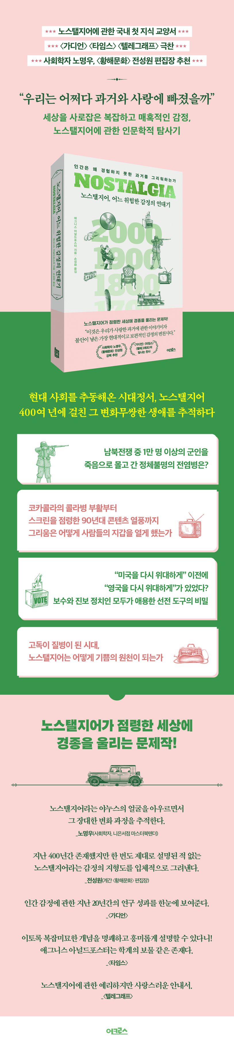 “노스탤지어의 물결이 세계를 뒤덮을 것이다.” 미래학자 앨빈 토플러가 《미래의 충격》에서 내놓은 예견은 50여 년이 지난 오늘날 더욱 크게 다가온다. 90년대 프로그램이 재방영되고, 한 시대를 풍미했던 노래가 음원 차트의 상위권을 차지하고, Y2K 패션이 유행을 선도한다. 기업들은 아날로그 향수를 자극하는 제품들을 출시하며, 정치인들은 더 나은 미래를 약속하기보다 더 나았던 과거를 상기시킨다. 전 세계가 노스탤지어에 젖어 있지만, 우리 대부분은 노스탤지어가 무엇인지, 그것이 어떻게 변화해왔고 우리에게 어떤 영향을 미치는지는 거의 알지 못한다.