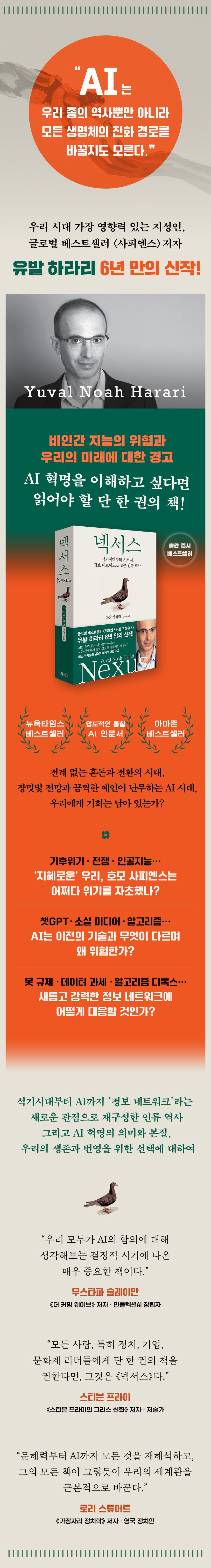 상아탑 속 자신의 방에만 안주하지 않고 정치학, 종교학, 매체학, 진화생물학, 컴퓨터과학 등 다양한 학제 간 지식을 습득해온 하라리 교수의 독창적인 역사적 시각과 스토리텔링은 인류를 위한 중요한 선택의 순간에 빛을 발한다. 《사피엔스》 《호모 데우스》에서 펼쳤던 그의 논지가 ‘정보’를 중심으로 통합되어 더 정교하게 실체를 드러내는 《넥서스》에서 우리는 하라리 교수의 도저한 ‘현실주의’적 해법을 만난다. 비인간 지능이 우리의 존재를 위협하는 현재, 우리는 실수할 여유가 없다.