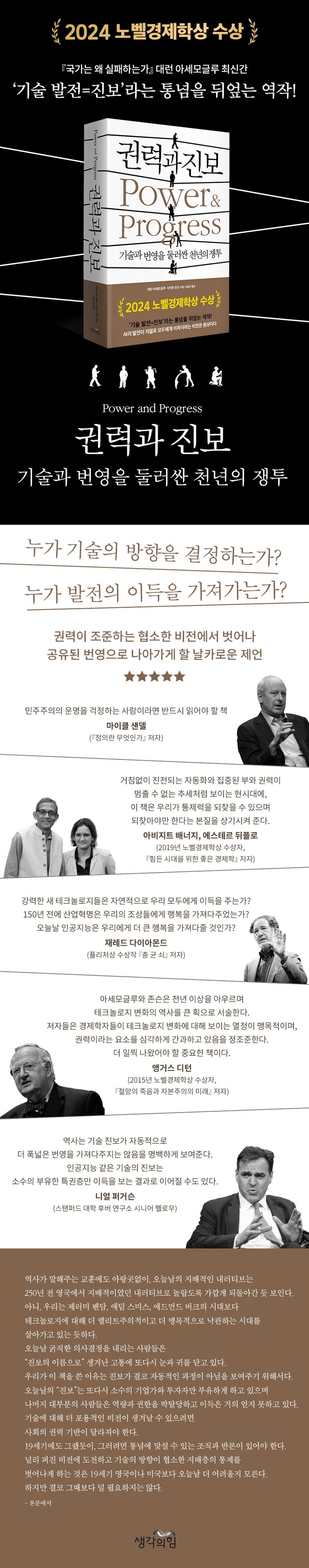 『국가는 왜 실패하는가』로 찬사를 받은 대런 아세모글루의 최신간 『권력과 진보』가 출간되었다. 우리 시대 최고의 경제학자 중 한 명으로 꼽히는 아세모글루는 예비 노벨상이라 일컬어지곤 하는 ‘존 베이츠 클라크 메달’을 수상하였고, 지난 25년간 번영과 빈곤의 역사적 기원과 새로운 테크놀로지가 경제 성장, 고용, 불평등에 미치는 영향을 연구해 왔다. 저자 아세모글루와 존슨은 『권력과 진보』에서 과거와 현재를 아우르는 광범위한 연구를 토대로, 정치적·사회적 권력이 어떻게 기술 발전의 방향을 ‘선택’하는지, 그리고 테크놀로지가 어떻게 모두에게 이득이 되는 방향으로 발전할 수 있을지를 치밀한 논증과 함께 설득력 있게 제시한다. 저자들은 책에서 지배적인 계층(권력자와 엘리트)에 의해 설정되는 비전에 도전하고 테크놀로지의 발전으로 취한 풍요를 모두가 함께 공유하기 위해서는 사회의 권력 기반이 재구성되어야 한다고 주장한다.