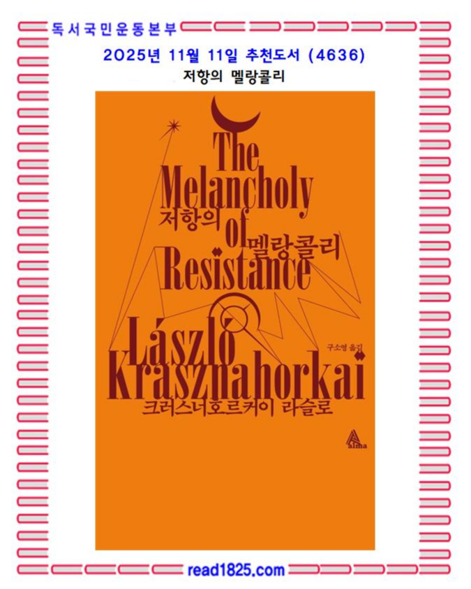 BBC가 선정한 2000년 이후 100대 영화 중 하나로 선정된 벨라 타르 감독의 영화 《베르크마이스터 하모니(Werckmeister Harmonies)》의 원작 소설 『저항의 멜랑콜리』. 데뷔작 《사탄탱고》에서 체제에 유린당한 사람들이 고통의 쳇바퀴에 포박되는 과정을 탱고의 스텝-앞으로 여섯 스텝, 뒤로 여섯 스텝-이라는 형식으로 구현했던 크러스너호르커이 라슬로의 이번 소설은 헝가리의 어느 작은 마을에 유랑 서커스단이 세상에서 가장 큰 고래를 보여준다며 들어서며 온갖 소문과 편집증이 난무하며 벌어지는 상황을 그려냈다.