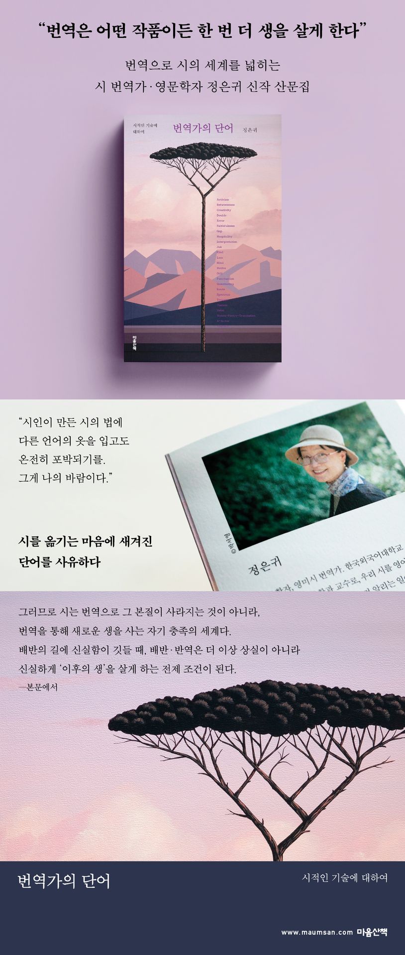 『번역가의 단어』의 단어 목록은 시를 옮기며 유난히 오래 고민했던 구체적인 사례부터 번역을 둘러싼 이론적 개념, 번역출판의 수많은 변수와 AI의 발달로 변화하는 번역가의 위상 등 외부적 상황을 아우른다. “시를 사랑하는 ‘찐 독자’이면서 번역가이고, 연구자이자 또 교육자”인 정은귀는 책에서 겹겹의 정체성을 껴안고 번역을 새로이 마주한다.