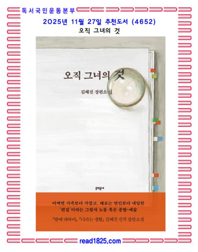 1990년대 초 교열자로 출판 생활을 시작해 일생을 문학 편집자로 살아가는 한 여성의 삶을 다루는 이 소설은, 내성적이고 운명에 순종적인 주인공이 책을 만들며 만난 인연과 사건을 통해 자신의 삶 역시 느리지만 꼼꼼하게 엮어나가는 모습을 잔잔하고도 단단한 필치로 담아냈다. 『오직 그녀의 것』은 그간 작가가 천착해온 ‘일’의 연장선상에 있으면서도, ‘노동’이라는 단어로만 말해질 수 없는 ‘일’이 품고 있는 풍부한 의미와 결을 하나하나 살려낸 작품이다. “일의 얄궂음에 쉽게 마음 상하지 않고, 일의 곤란함을 일축하거나 해석하지 않고, 일이 사는 시간을 본다”(김화진)는 추천의 말처럼, 일과 사랑과 사람 사이의 역학을 과장하거나 축소함 없이, 묵묵하게 그리하여 우아하게 펼쳐 보인다.