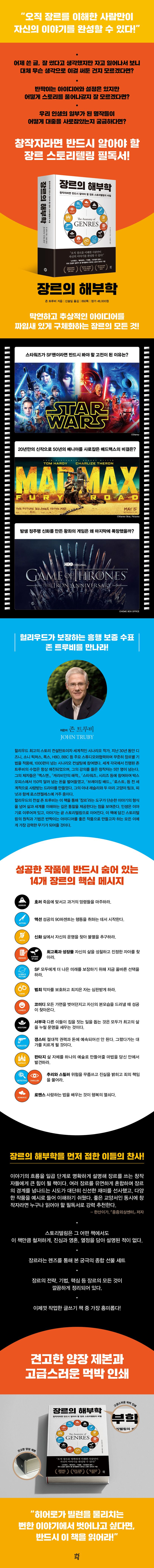 존 트루비는 그만의 노하우를 담아 수많은 작품에 참여하며 경험했던 장르의 구조나 심층 분석을 『장르의 해부학』에 녹여냈다. 이미 수많은 해외 작가들의 극찬을 받은 이 책은 누구나 장르를 체계적으로 이해할 수 있게 돕는다. 장르는 단순한 분류가 아니다. 그것은 작가가 세상을 바라보는 ‘렌즈’이며, 자신의 세계를 만들어가는 ‘궁극의 종합 선물세트’다. 콘텐츠가 중요해진 이 시대, 작가를 꿈꾸는 모든 이에게 이 책을 필독서로 추천한다.