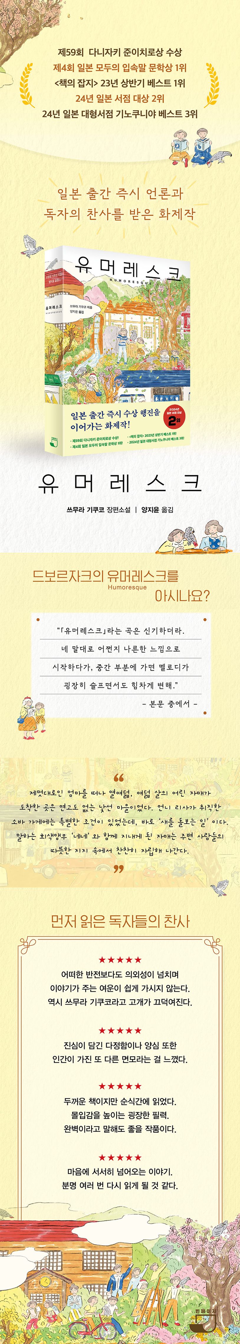 《유머레스크》는 쓰무라 기쿠코의 작품 중 가장 긴 분량의 장편소설로, 집을 떠나 낯선 마을에 정착한 자매의 삶이 40년간 펼쳐진다. 그들은 소바 가게 주인 부부와 특별한 앵무새 '네네'를 만나면서 혈연도 종족도 다르지만 가족보다 더 깊은 유대 관계를 만들어간다. 이들의 따뜻한 이야기를 따라가다 보면 어느덧 함께 성장한 우리의 모습을 마주할 수 있을 것이다.