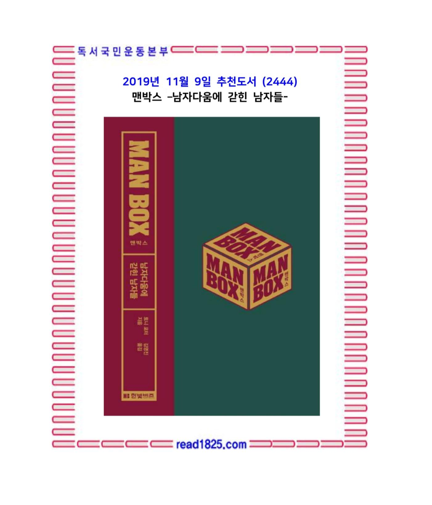 비교적 열린 성의식을 가진 미국에서조차 남성에 대한 성역할은 여성의 그것과는 다른 의미로 보다 폭넓게 강요되어 왔다.『맨박스(리커버)』는 책의 단초가 된 TED 강연 “A Call To Men”의 강연자 토니 포터가 저술한 책으로 우리가 당연하게 여겨왔던 ‘남자다움’을 의심한다. 그는 남자를 둘러싼 고정관념의 틀을 ‘맨박스’로 규정하고 이를 깨부숴야 한다고 주장한다.