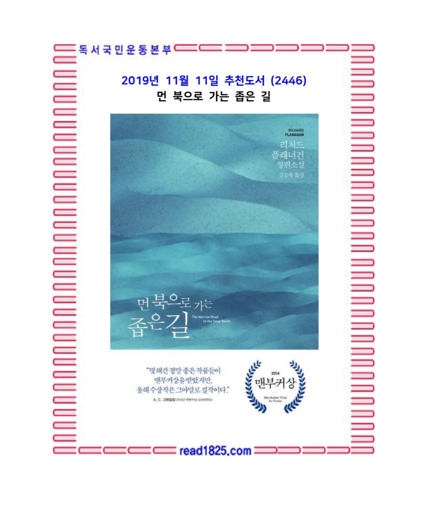 오스트레일리아 현대문학사에서 가장 빛나는 상상력의 소유자로 거론되는 리처드 플래너건이 12년간 심혈을 기울여 완성해낸 걸작 『먼 북으로 가는 좁은 길』. 오스트레일리아판 《전쟁과 평화》라는 평을 받으며 2014년 맨부커상을 수상한 이 작품은 제2차 세계대전 당시 일본군의 태국-미얀마 간 철도건설 현장에서 살아남은 전쟁 포로이자 현재 화려한 전쟁영웅으로 부활한 외과의사 도리고 에번스의 기억과 현실을 중심으로 사랑과 죽음, 전쟁과 진실, 상실과 발견의 세계를 그리고 있다.