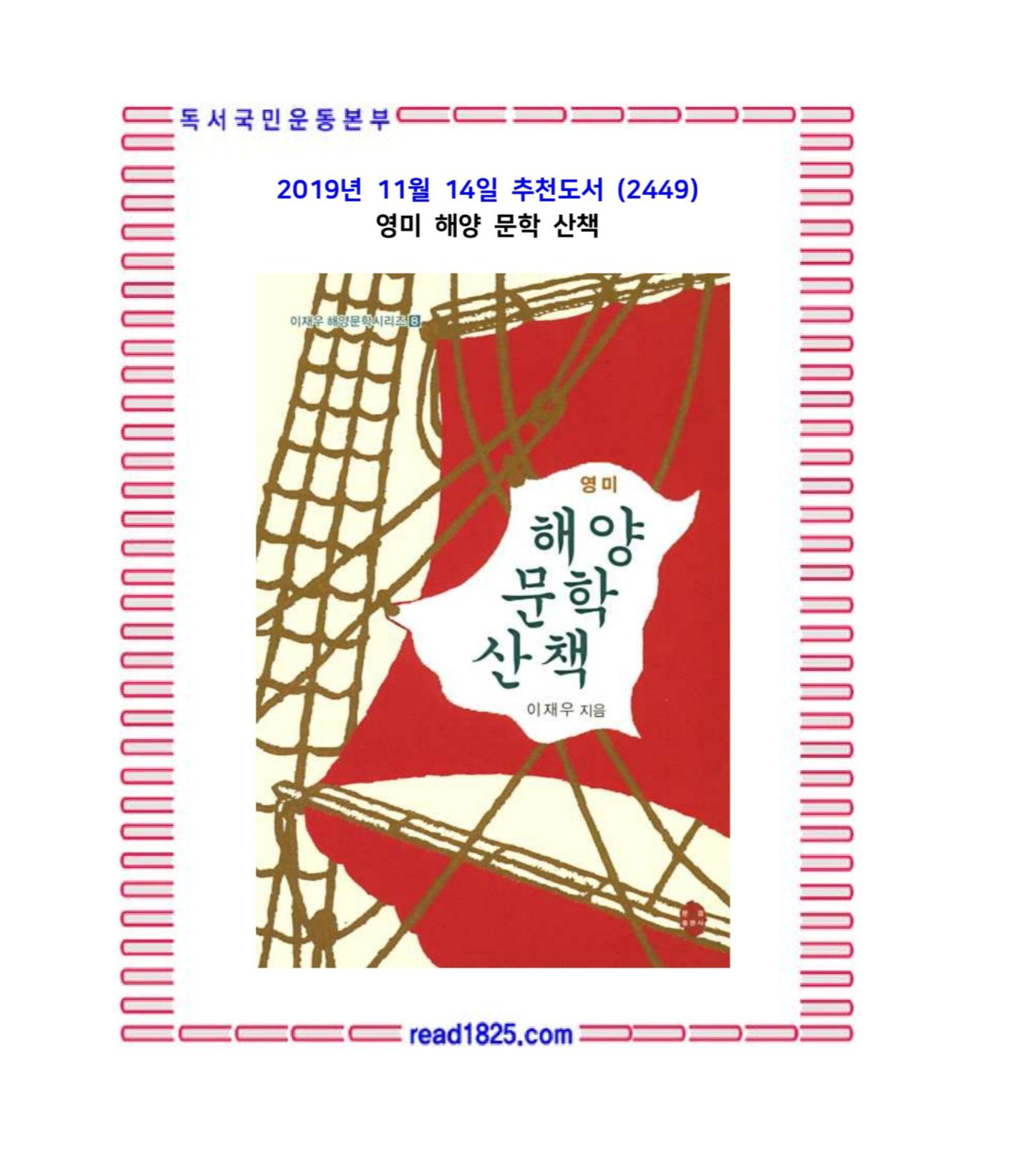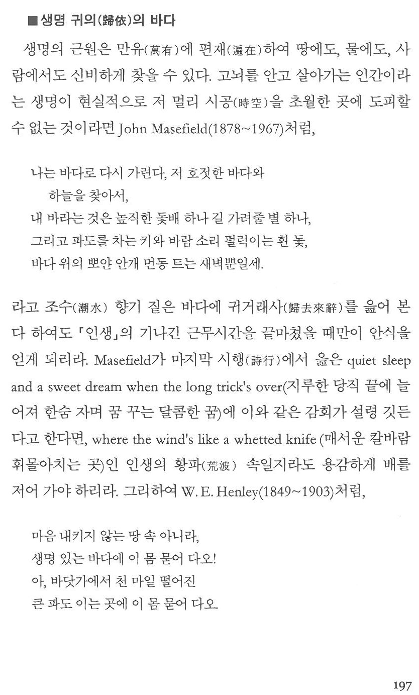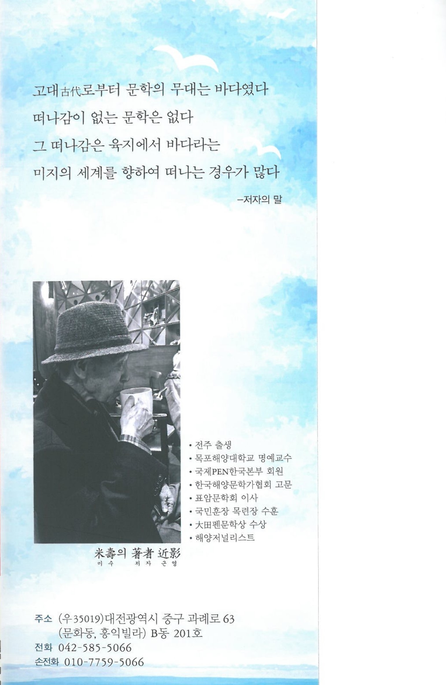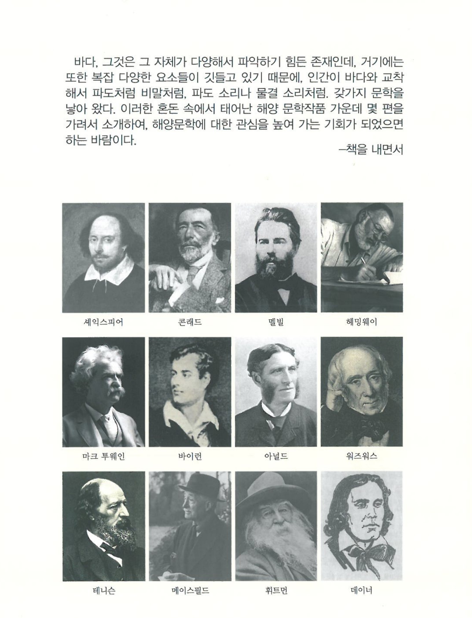 근대와 현대의 세계 문학 속에서 확고한 자리를 굳히고 있는 해양 소설 작품들. 그 속에서 인간과 바다가 한데 어울려서 독자를 끌어들인다, 정말로 풍성한 문학의 대양에. 작가들의 해상 체험이야말로 그 문학적 비중을 높이고 있는 것이 아닐까. 19세기부터 오늘날에 이르기까지, 한결같이 흐르고 있는 바다와의 일체감은 현대의 많은 작품 속에서도 그대로 살아있다. 구미의 여러 나라뿐만 아니라 중남미에서도, 빼어난 그리고 유니크한 해양문학이 탄생하고 있다는 점에 주목해야 한다. (17p)