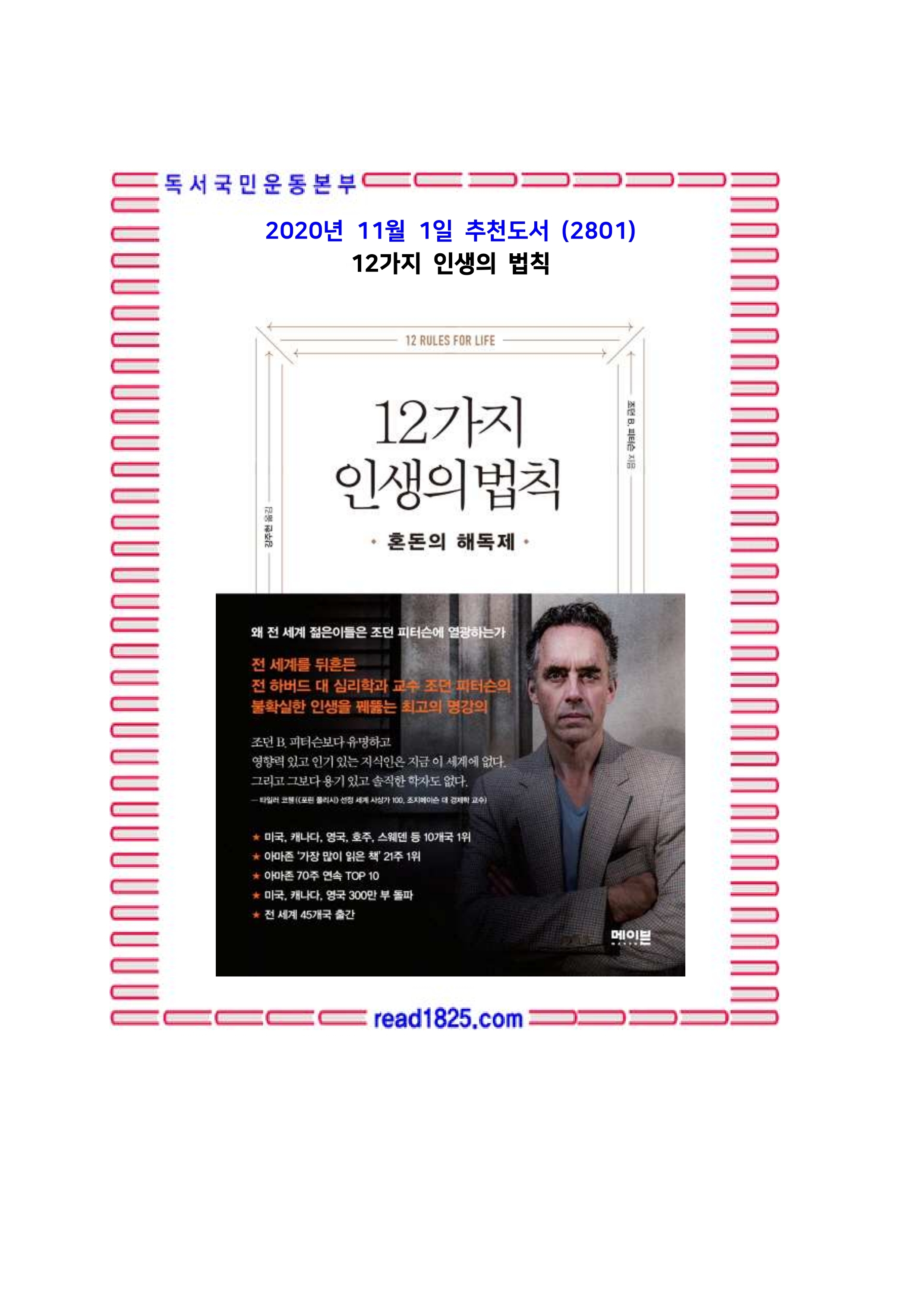 고된 삶에 무너지지 않고 의미 있는 삶을 사는 지혜를 12가지 법칙에 담아 전하는 전 하버드대 심리학과 교수 조던 피터슨의 『12가지 인생의 법칙』. 이 책은 영미권 최고의 질의응답 사이트인 ‘쿼라(Quara)’에 올라온 질문에 답을 쓰는 저자의 취미에서 시작되었다. ‘인생에서 누구나 알아야 할 가장 소중한 것은 무엇일까?’라는 질문에 40개의 법칙에 대한 답을 올렸고, 이 목록은 12만 명이 읽으며 큰 호응을 얻었다.