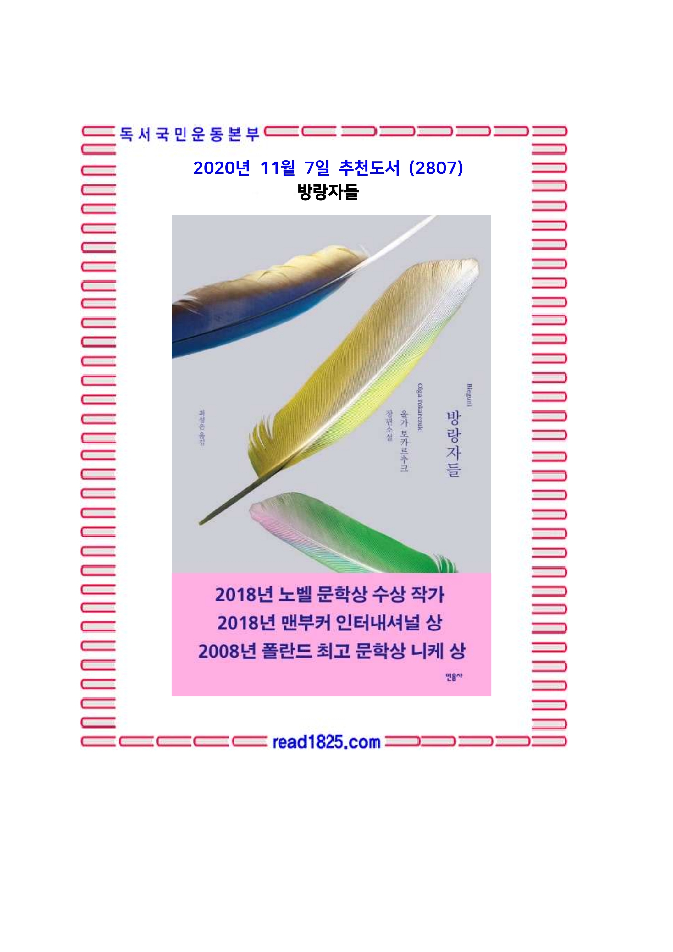 2008년 폴란드 최고의 문학상인 니케 문학상을, 2018년도에는 맨부커 상 인터내셔널 부분을 수상한 『방랑자들』은 단선적 혹은 연대기적인 흐름을 따르지 않고, 단문이나 짤막한 에피소드를 촘촘히 엮어서 중심 서사를 완성하는 패치워크와도 같은 이야기 방식이 가장 절묘하고 효과적으로 활용된 사례로 평가받는다. “물리적인 이주(移住)와 문화의 이행에 초점을 맞춘, 위트와 기지로 가득한 작품”이라는 한림원의 평가에 저절로 고개가 끄덕여지는 작품이다.