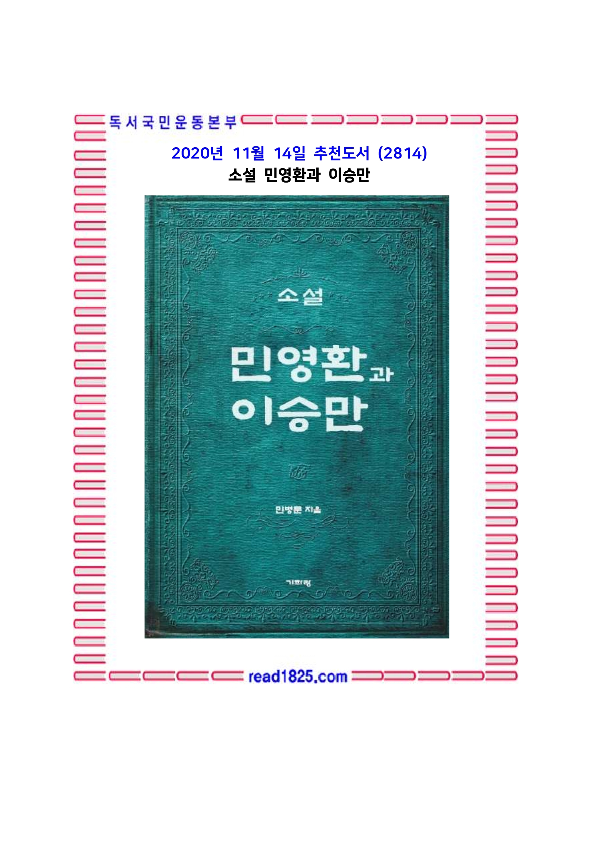 이 책은 이승만(대통령)과 민영환(충정공)이 구한 말 암흑 시절 대한제국 자강 자립을 위해 손잡고 뛴 이야기를 소설로 엮은 것이다. 이미 드러난 역사적 사실 이외 당시 두 사나이와 얽힌 사건, 일화는 거의 작가 상상력으로 틈을 메웠다. 그렇지만 뼈대는 역사적 사실임을 강조한다.