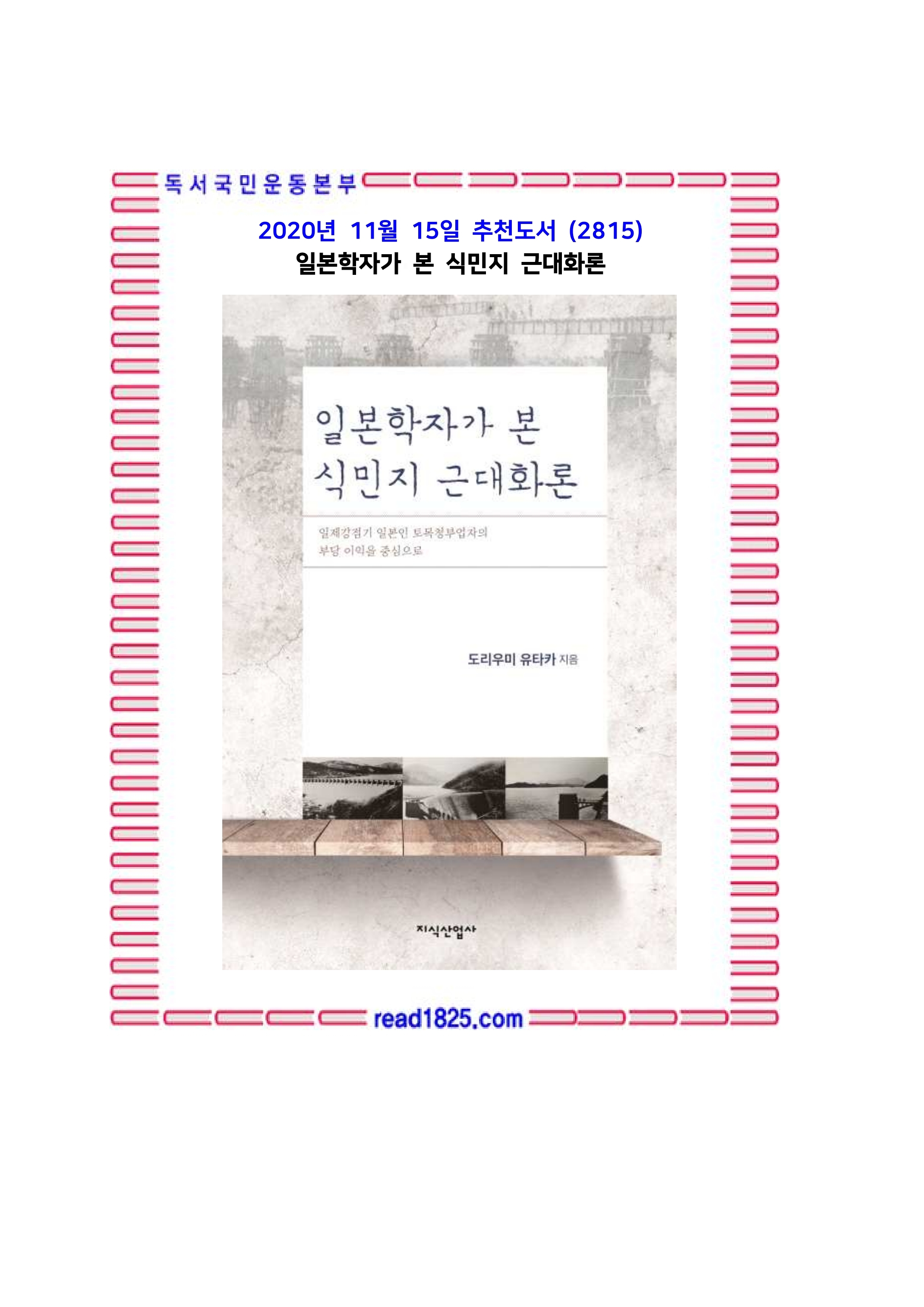 일본학자의 눈으로 일제강점기 토목업을 둘러싼 조선 경제의 실상을 실증적인 방법론으로 탐구한 문제작이 출간된다. 《3ㆍ1독립만세운동과 식민지배체제》(이태진ㆍ사사가와 노리카쓰 공편, 2019)에서 일제가 조선에 뒤늦게 투자를 시작하면서 식민지 근대화론을 선전했음을 지적한 도리우미 유타카 한국역사연구원 상임연구원(선문대학교 강사)은 이 책에서 그 장밋빛 발전의 허구를 낱낱이 파헤친다. 일본인으로서 양심에서 우러나오는 차분한 사색과 일본학자 특유의 정치한 논리는 독자들을 이내 사로잡는다.