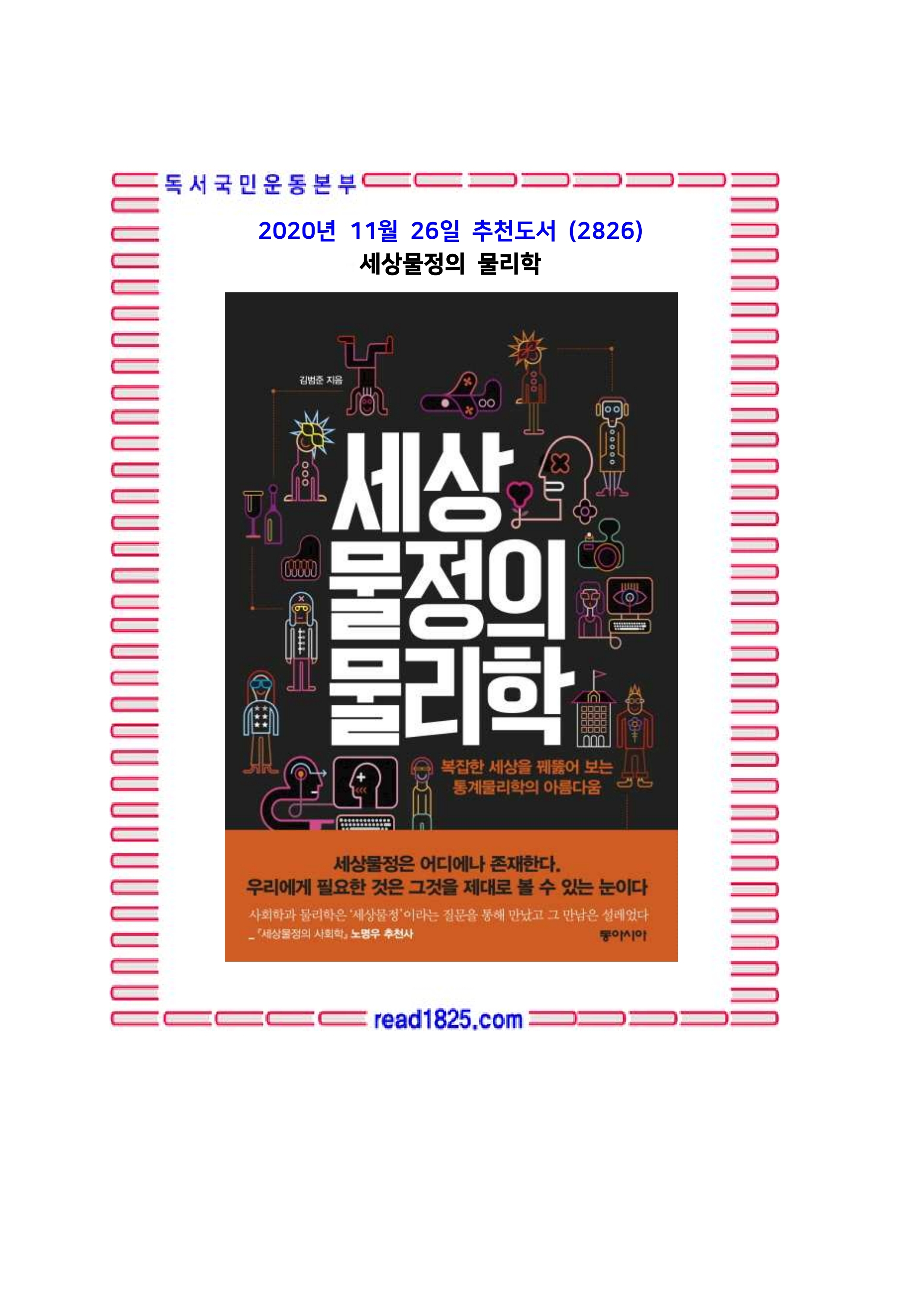 몇 해 전 한 사회학자(『세상물정의 사회학』 저자 노명우는 『세상물정의 물리학』 추천사를 썼다)가 앉았던, ‘세상물정’이라는 질문이 놓인 테이블에 성균관대 물리학과 김범준 교수가 마주 앉았다. 물리학자와 사회학자가 마주 앉은 테이블, 침묵 이외의 다른 사건을 상상하기 어려운 이 자리에서 대체 어떤 이야기가 오갈까? 사회학과 물리학의 연구대상을 떠올려보면, 언뜻 두 학문의 접점이 보이지 않는다.