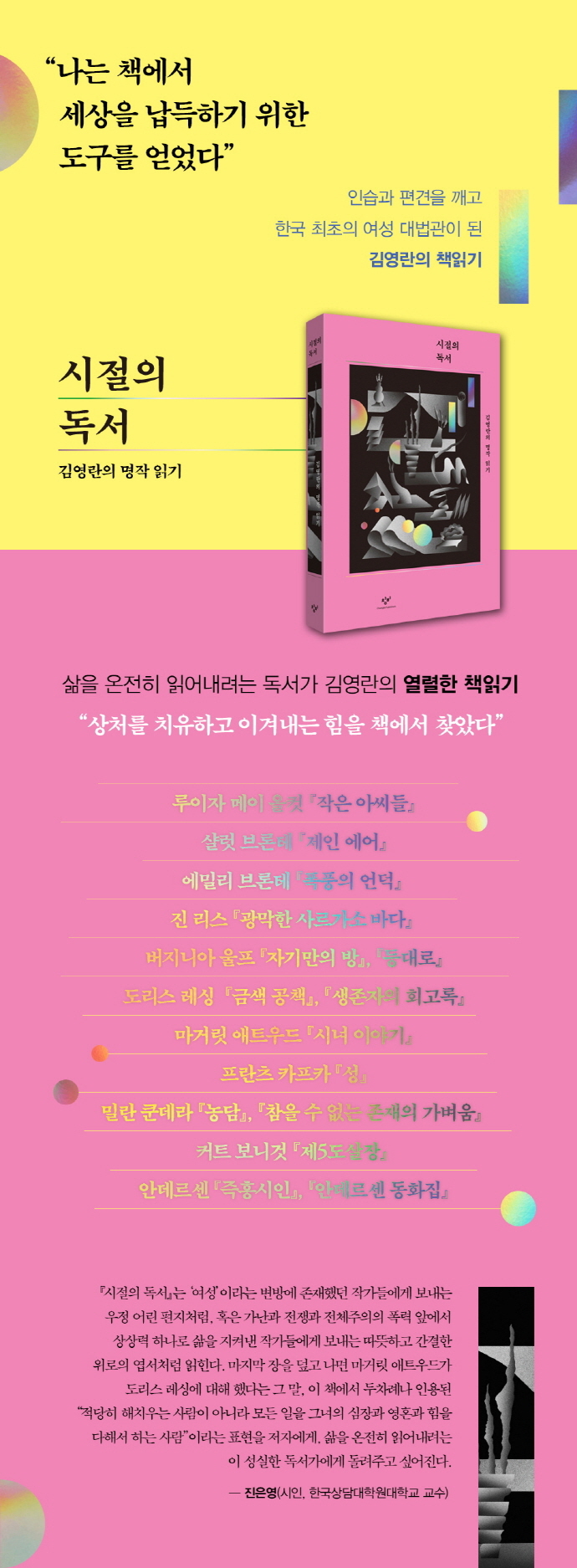 한국 최초의 여성 대법관이자 ‘소수자의 대법관’ 김영란이 자신의 삶을 구성했던 독서의 경로를 담은 책 『시절의 독서』를 펴냈다. 김영란은 1981년부터 판사로 일했고 2004년부터는 6년간 대법관으로 재직하면서 우리 사회의 정의 확립과 민주주의의 가치를 지키는 데 앞장서왔다. 그는 30년 가까이 한국사회의 최전선에서 법률가로 살아왔으면서도 평생 유일하게 계속해온 것이 책읽기뿐이라고 말할 정도로 열정적인 애독가다. 이 책에서는 특히 문학작품에 대한 그의 해박한 지식과 작가에 대한 다정한 관심, 텍스트를 사회현실과의 긴밀한 연관 속에서 바라보는 통찰력을 엿볼 수 있다. 어린 시절 탐독한 『작은 아씨들』과 브론테 자매의 소설, 일과 가정에서의 의무를 동시에 요구받았던 여성의 입장에서 읽은 도리스 레싱, 직업적 법률가라는 정체성과 경험을 통해 해석한 카프카, 6월항쟁 직후의 정치적 상황 속에서 읽은 쿤데라 등을 대상으로 작가와 문학의 관계, 문학과 현실의 관계에 대한 깊이 있는 분석과 사색을 담았다. 한편 이 책은 삶에서 부딪히는 상처를 극복하기 위해, 미로 같아 보이는 세상을 납득하기 위해 책읽기에 열렬히 빠져들었던 김영란의 내밀한 고백으로도 읽힌다. 일생 내내 자유를 꿈꾸기 힘든 시대를 살았던 그에게 문학은 다른 세상을 꿈꾸게 해주는 유일한 탈출구였다. 김영란에게 문학은 ‘거짓으로의 도피’가 아니라 ‘거짓으로부터의 도피’였으며, 그가 책으로부터 얻은 위로와 격렬한 현실 인식이 이 책을 통해 독자들에게도 전해지리라 기대한다.