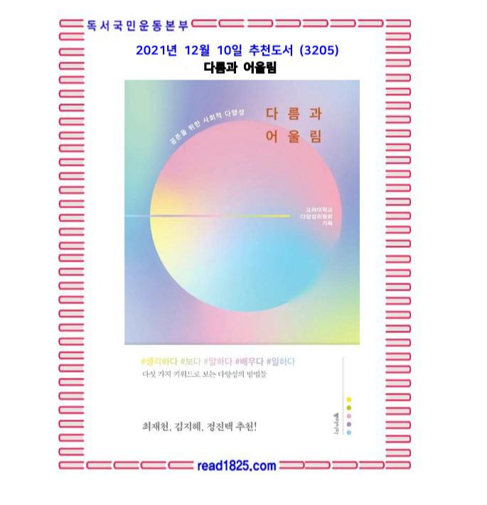 타자화를 경계하기 위해 저자들은 남이 아니라 ‘자신’의 경험에 집중하고, 책은 다양성에 대한 여러 논제 중 어느 하나를 취사선택하는 대신 여러 주제를 다룬다. 그럼으로써 다양성이 ‘우리 모두’의 이야기임을 보여준다. 사회적 다양성은 특정한 누군가에게만 해당하는 것이 아니다. 다름이 타인의 다름을 인정하는 것에 그치지 않고 모두가 공존하기 위한 어울림으로 나아갈 때, 사회적 다양성은 비로소 우리의 일상과 함께할 수 있을 것이다.