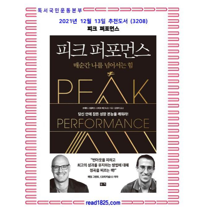 “브래드와 스티브는 우리가 각자의 분야에서 더 효율적으로 일할 수 있도록 세계 최고의 성과를 내는 사람들의 비밀을 밝혀 주었다. 이 책은 운동선수, 예술가, 경영인을 포함한 모두의 필독서다. 기본적으로 지금 가진 능력을 한 단계 올리고자 하는 모두를 위한 책이다.” _밥 코커(벤록캐피털 파트너, 스탠퍼드대학교 의과대학 겸임 교수, 전(前) 미국 대통령 보건정책 특별보좌관)