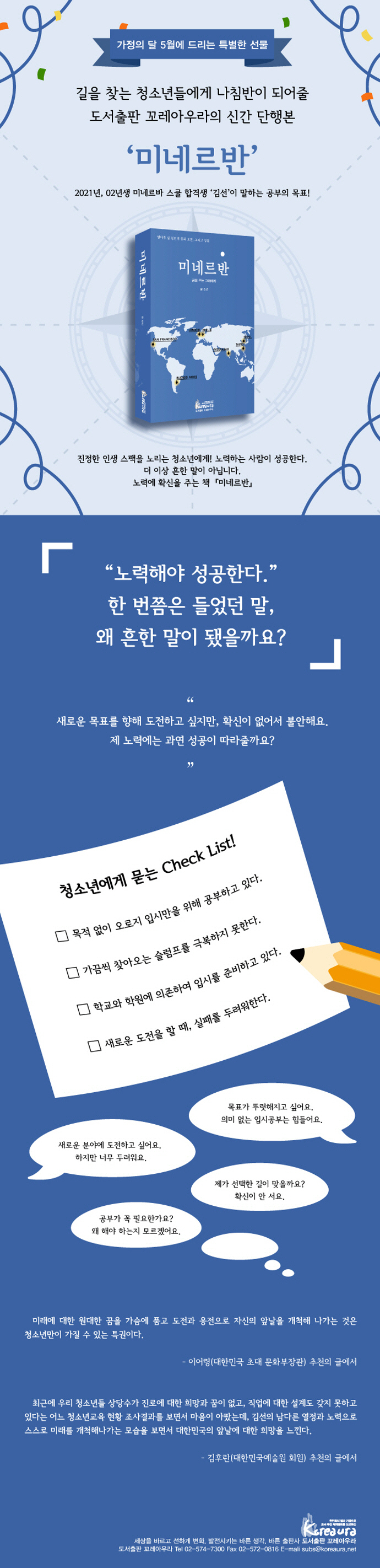 ‘미네르반’은 대한민국 학생들에게 세상을 넓게 보는 시야를 만들어주는 책입니다. 책 단원마다 도움글을 통해 교육 프로그램의 교육과정들을 알려주기도 하고, 필요한 지식들을 제공하기도 합니다. 자신의 실패 원인을 분석하여 극복하는 보여주는 모습은 학생들에게 목표관의 성립을 도와주고 새로운 분야에 도전하는 것을 두려워하지 않게 만들어주며, 자신이 선택한 길에 확신을 갖게 만들어주는 길잡이 역할을 합니다.