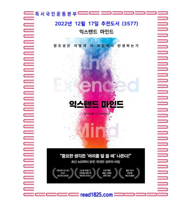 이처럼 《익스텐드 마인드》는 ‘나’의 능력을 높이면서도 주변 사람과 함께 성장할 수 있는 길을 여는 책이다. 모니터 앞에 앉아 빈 화면을 보며 아이디어가 떠오르길 초조하게 기다리는 기획자, ‘머리가 터질 것 같다’고 외치는 학생과 직장인들, 구성원 간의 소통과 생산성을 고민하는 관리자와 교육자, 스쳐 지나가는 아이디어를 완성작으로 만들고 싶은 창작자, 그리고 인생이라는 ‘머리 밖 세상’에서 슬럼프를 겪는 모든 사람에게 이 책은 직접 시도해 볼 만한 사례 꾸러미를 선물한다. 책장을 덮고 나면 확장된 것은 지능이나 창조성뿐만이 아님을 느낄 것이다. 머리 밖에서 바라본 ‘나’는 더 이상 이전의 자신이 아니다.