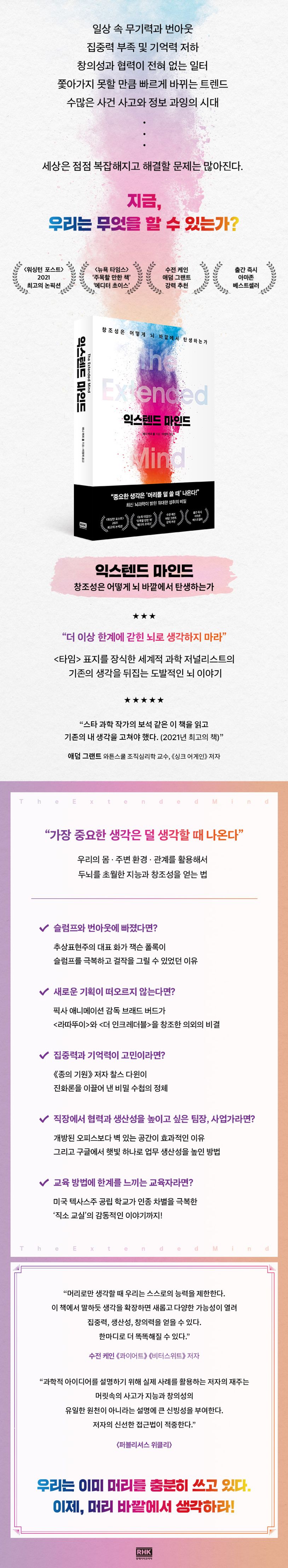 《익스텐드 마인드》는 점점 빠르고 복잡해지는 현대 사회에서 우리에게 필요한 능력이 머리 바깥의 자원을 활용하는 것이라고 말한다. 책의 원제이자 동명의 이론인 ‘확장된 마음(The Extended Mind)’ 및 그와 관련된 인지 연구에 따르면, 인간은 몸(움직임), 주변 환경, 인간관계 등 외부 자원을 활용해 집중력, 기억력, 창의력을 월등히 높일 수 있다. 이 책에서는 그동안 알려지지 않았던 뇌의 이면과 함께 인지 능력을 확장할 수 있는 실천 가능한 방안을 제시한다. 잭슨 폴록, 조너스 소크, 찰스 다윈 등 수많은 예술가, 과학자, 작가, 교육자는 어떻게 ‘머리 바깥의 생각’을 통해 어려움을 극복하고 성취를 이뤘을까? 독자는 생생한 사례와 흥미진진한 이야기를 따라가며 자신의 일상, 직장, 교육 현장에서도 다양한 방법을 적용할 수 있을 것이다.