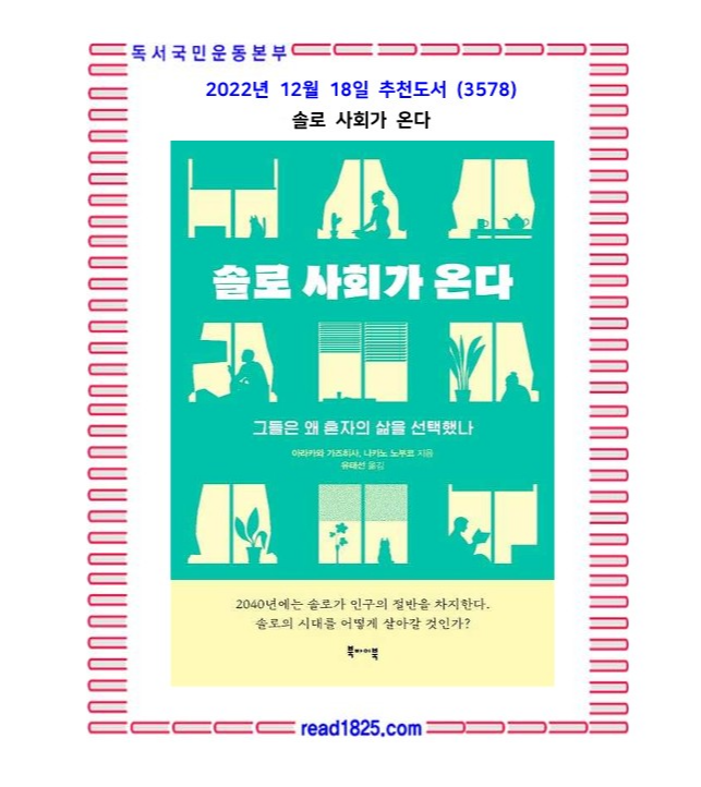 솔로화에 따른 사회 구조 전환은 우리 모두가 공통으로 직면한 상황이며 피할 수 없는 미래다. 그러니 이 책의 내용에 전적으로 동의하지 않더라도 이 책이 여러분이 뭔가 감정 변화를 깨닫거나 행동할 수 있는 계기를 마련하고, 앞으로의 삶의 방식을 생각하는 데에 도움이 되길 바란다.